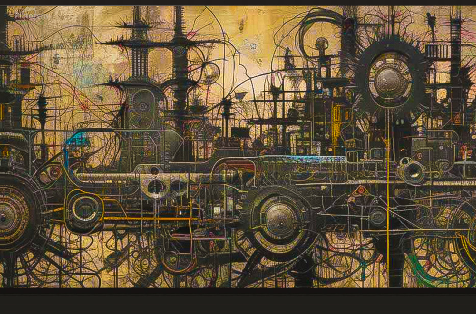 The image is a digital art piece that depicts a complex and intricate machine or structure. It appears to be made up of various interconnected gears, ...[+]