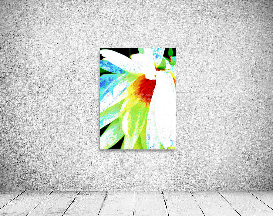 Originally a close up photo of a Daisy flower laterally digitally manipulated to create a stunning piece of contemporary floral art. Features bright petals in shades of white and blue surround a vibrant red center, creating a high-contrast floral depiction. The image exudes a sense of energetic transformation through its vivid color palette.