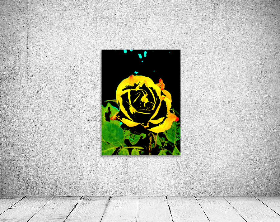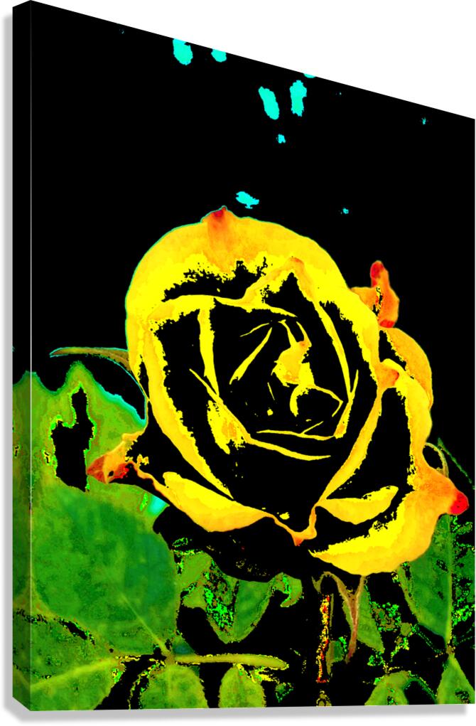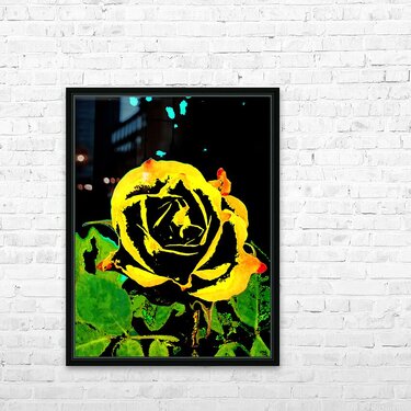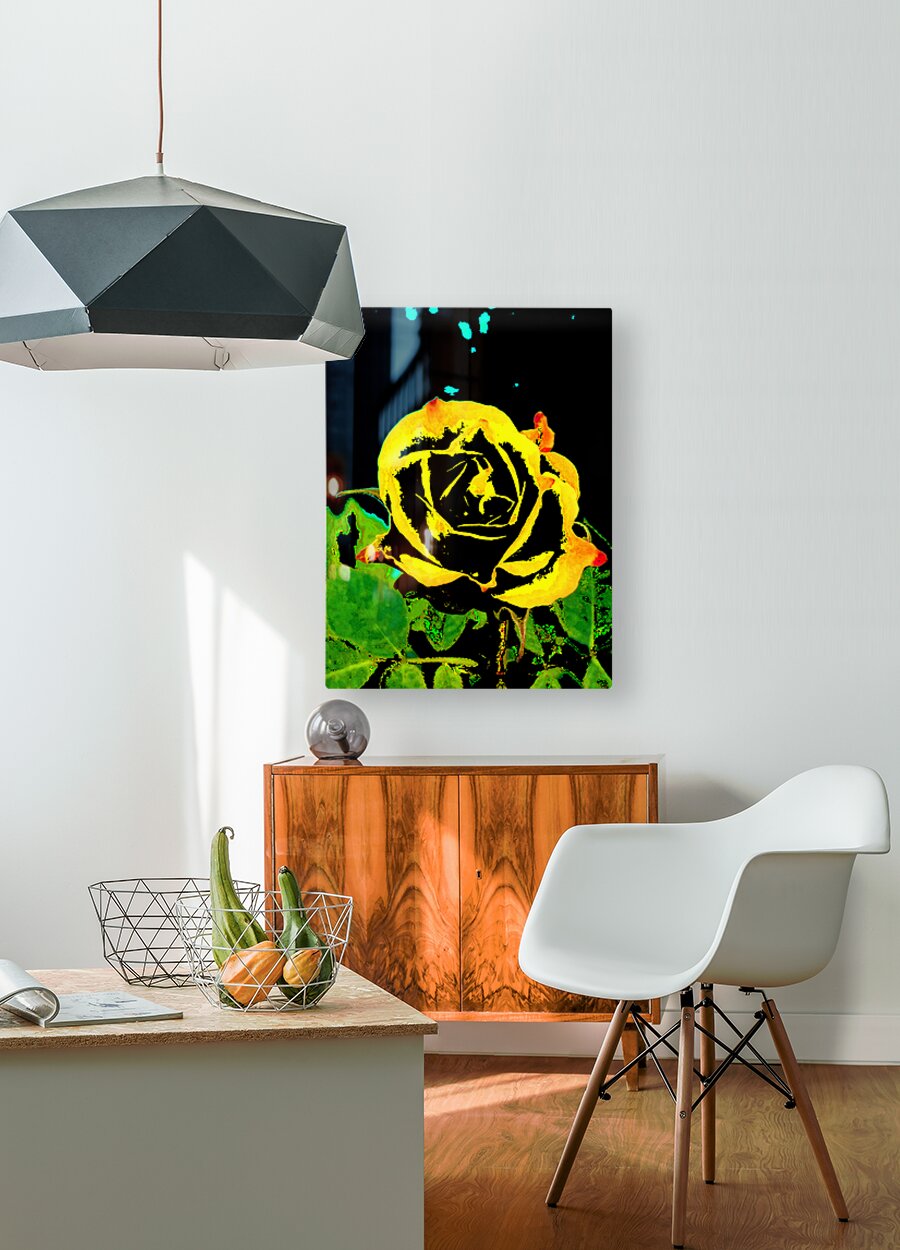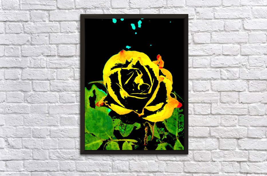 Originally a close up photo of a Daisy flower laterally digitally manipulated to create a stunning piece of contemporary floral art. Features a vibrant yellow rose standing out against a stark black background, with hints of green from the leaves. The petals are accentuated by a mix of shadow and light, creating a dramatic contrast.