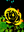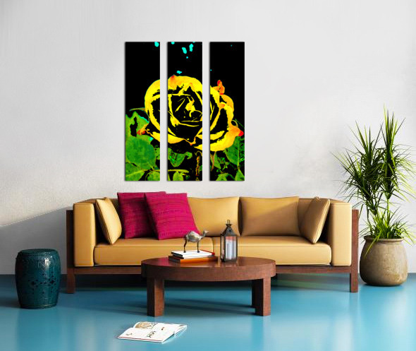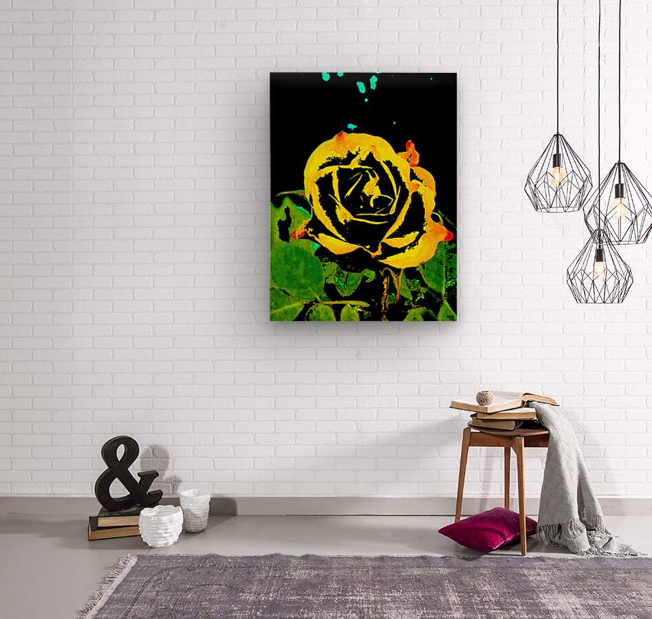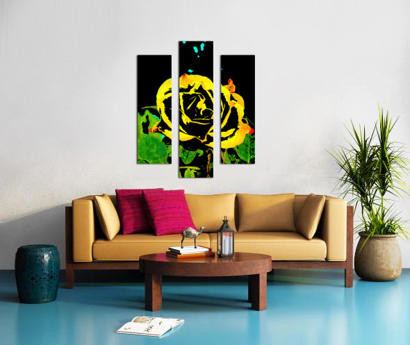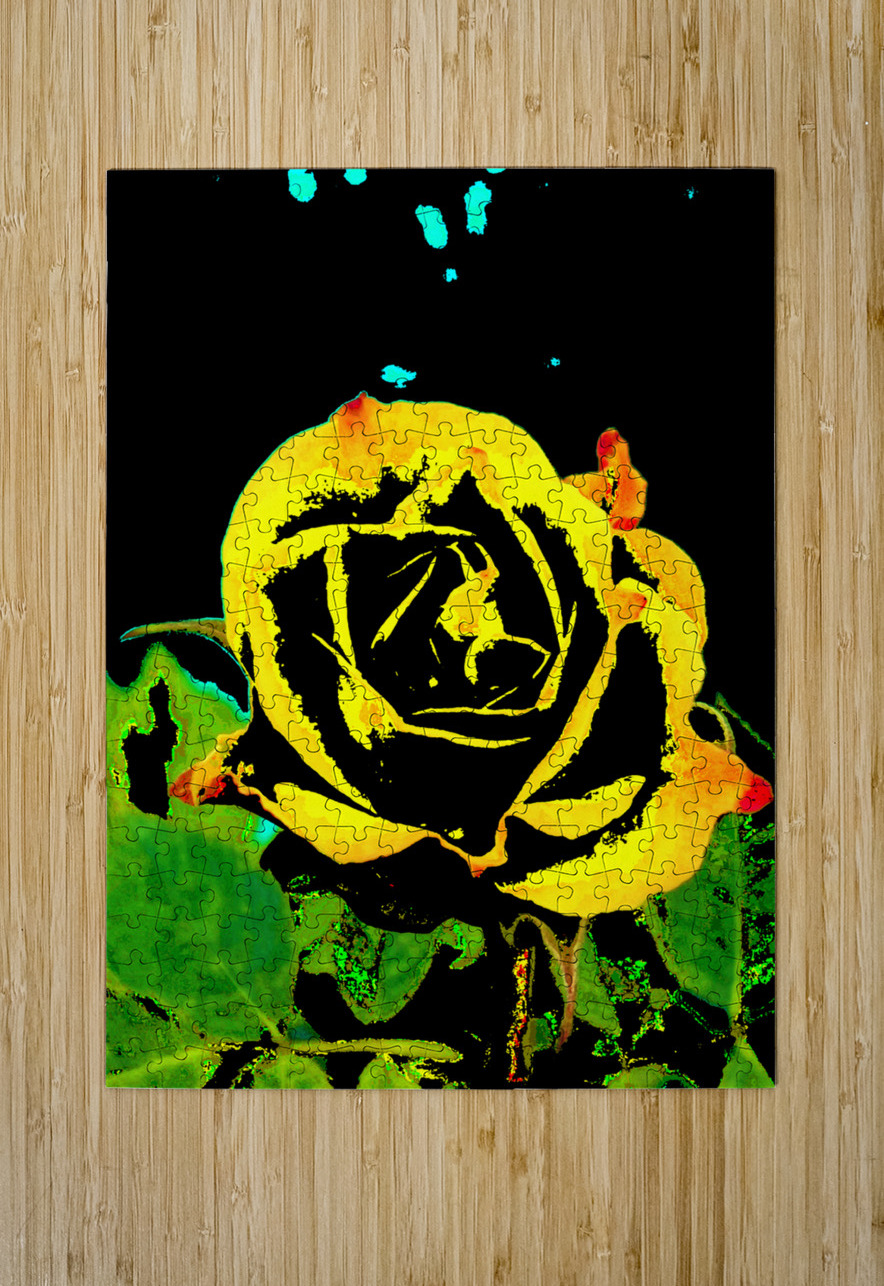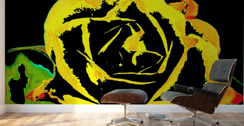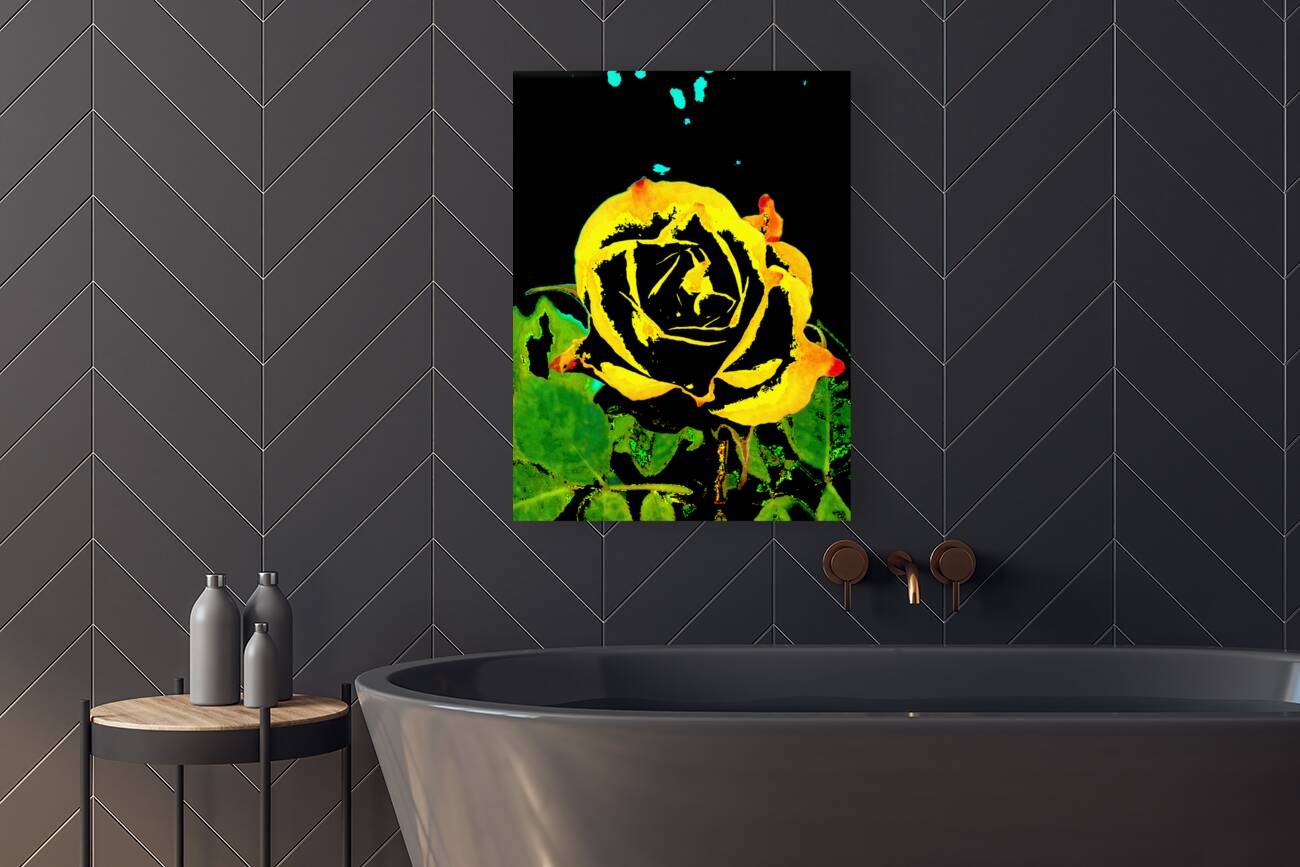 Originally a close up photo of a Daisy flower laterally digitally manipulated to create a stunning piece of contemporary floral art. Features a vibrant yellow rose standing out against a stark black background, with hints of green from the leaves. The petals are accentuated by a mix of shadow and light, creating a dramatic contrast.