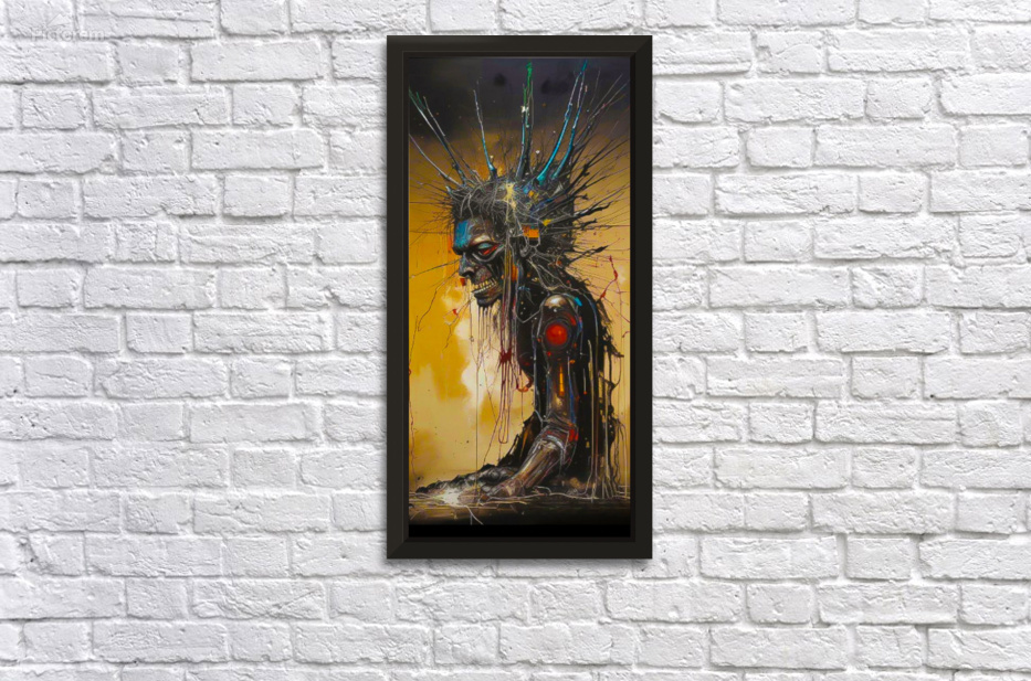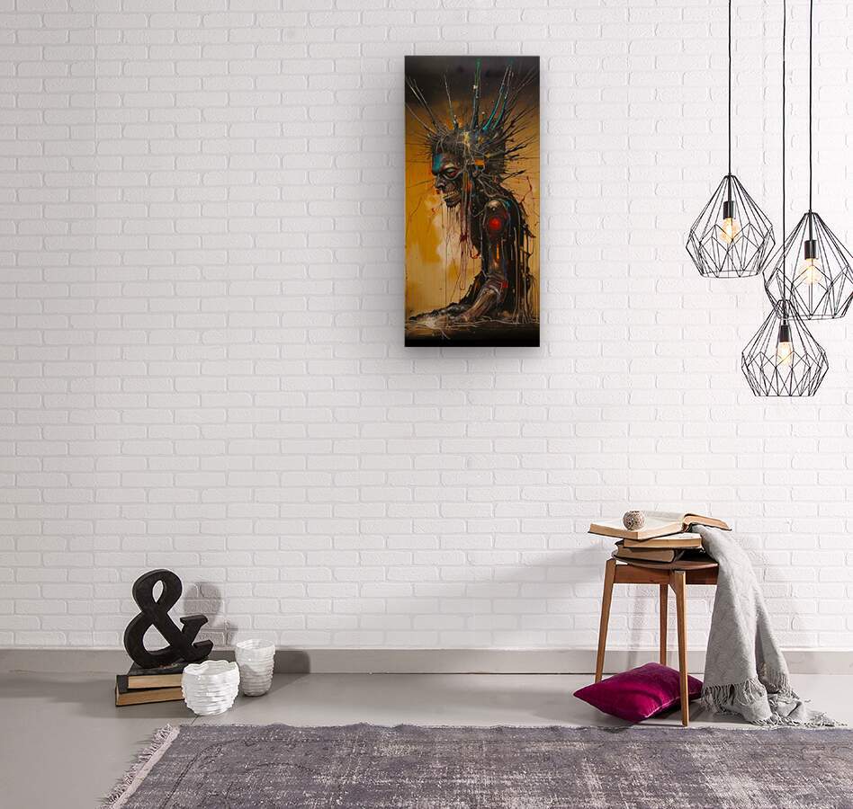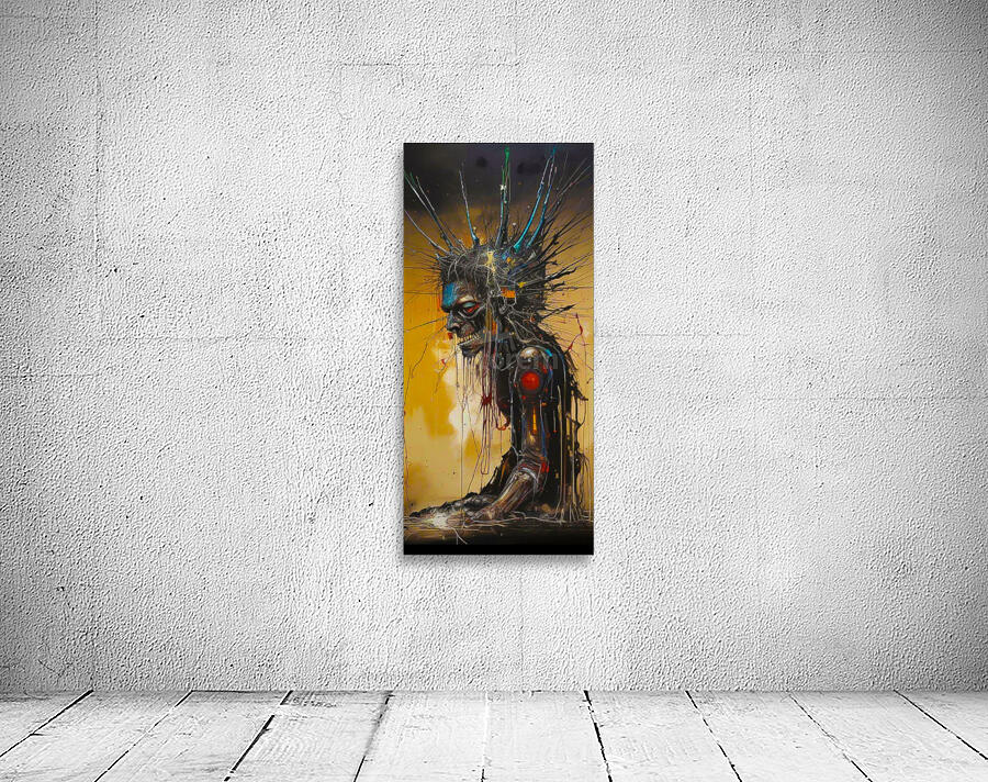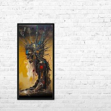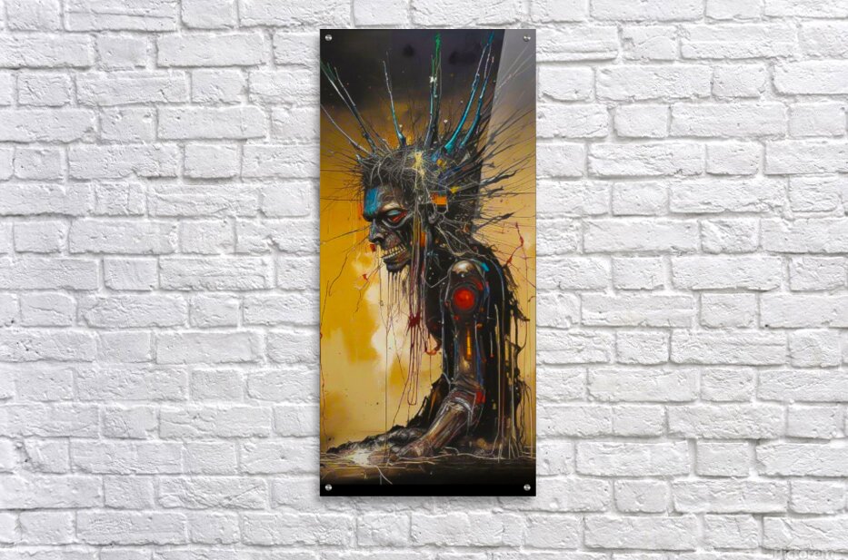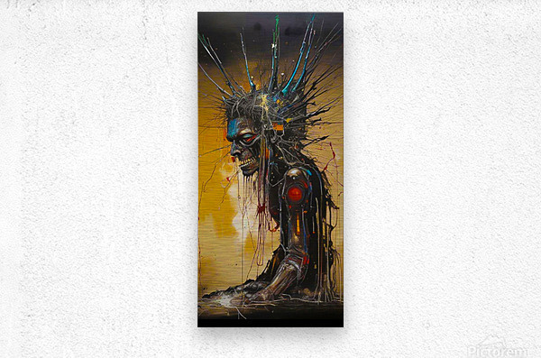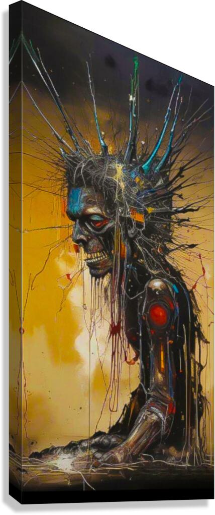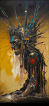 The image depicts a grotesque, cyborg-like figure with a skeletal face, a jagged, metal-like crown, and a mechanical arm. The figure is partially obscured by a web of wires and cables, and the background is a swirling mix of gold and black. The figure's expression is one of anguish or pain, and the overall tone of the image is one of dystopia and decay. The image is evocative of a post-apocalyptic world, where humanity has been corrupted by technology and the lines between man and machine have blurred. The use of stark colors and contrasting textures creates a visual impact that is both disturbing and captivating.