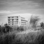 The Port Royal Hotel in Wildwood Crest New Jersey. I took this black and white shot because I was more interested in the strong vertical lines and the repeating pattern of the balconies. I had a nice overcast morning to get this shot with nice even lighting. They symbols and shapes on the building are normally very colorful so I tried to bring that into this black and white photo via very dark blacks and very bright whites.