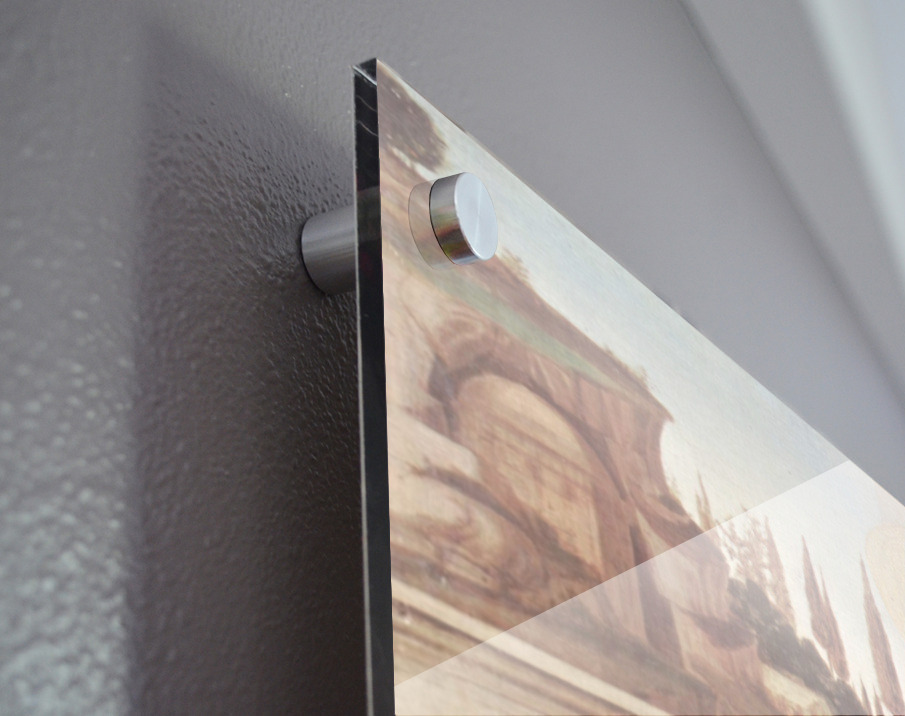 Printed to the edge - Ready to hang - provided with 4 premium polished aluminum stand off ( wall screws and mounting hardware provided )