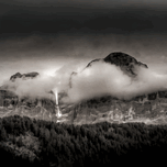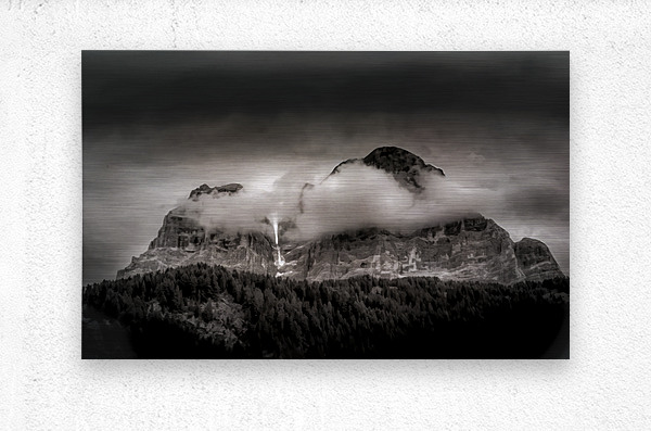 Dolomite, Fusine, Mount Pelmo, part of the Alto Adige, province of Belluno, in northeastern Veneto, Italy. It is clearly delineated from other peaks, making a stunning view, so it can be clearly seen from the neighboring valleys and from nearby mountains of Antelao and Monte Civetta, edited in a black and white edited version, To the west of the summit is a secondary peak, Pelmetto, "Little Pelmo" at 2,990 m altitude. This view was captured on the way up to the old mountain village of San Vito di Cadore. It is often surrounded by clouds as it was this day. Part of a UNESCO designated area.