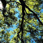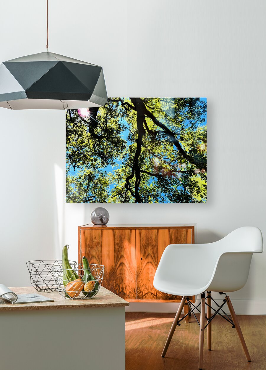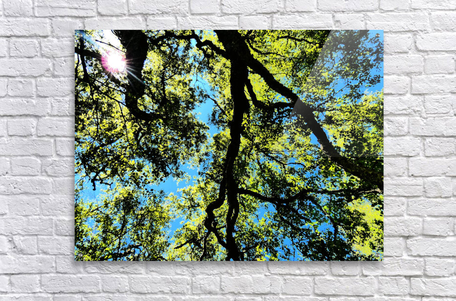 A coloured photo taken using the Intelligent Art photographic creative filter. Features sunlight filtering through a Birch Tree canopy of leafy branches set against a bright blue sky. Twisting limbs create an intricate pattern, highlighting the vibrant greens of the foliage.
