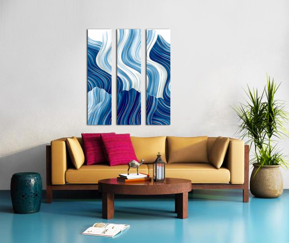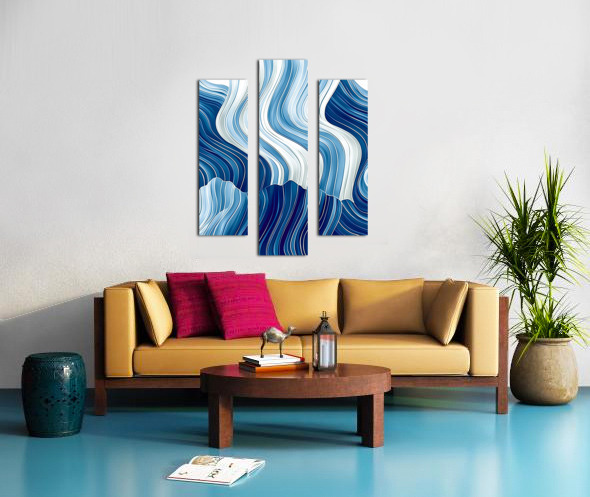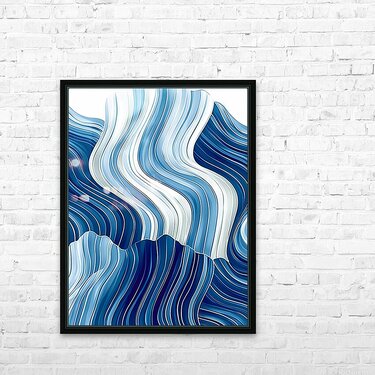 Wavy blue and white lines create a fluid abstract pattern reminiscent of ocean waves or flowing fabric. The design is dynamic with variations in shade...[+]