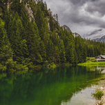 A perfect little lake in the Hohlenstein valley, framed by evergreen trees and nearby mountains, framing this little local restaurant, What a perfect location on the way to Lake Misurina with a view of Tre Cime.