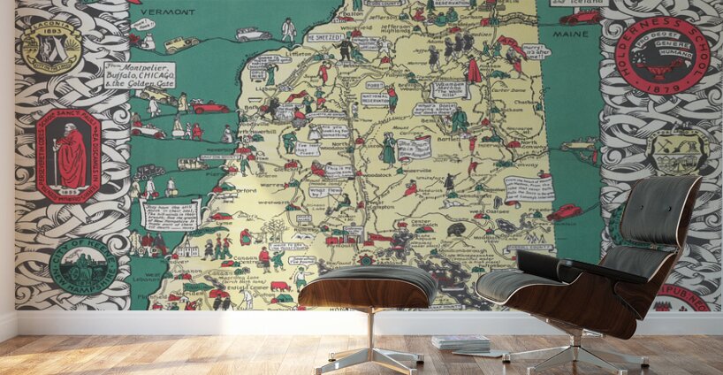 Get this artwork "1926 Pictorial Map of New Hampshire – Whimsical and Informative Illustration Featuring Towns Landmarks Mountains and Local Folklore in a Classic New England Decorative Style" in a framed print.
