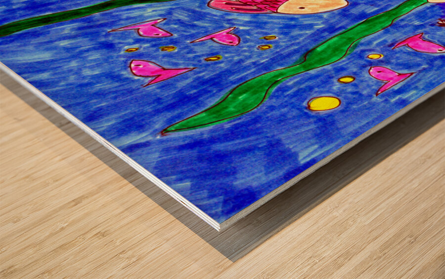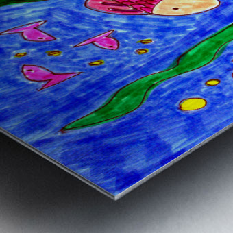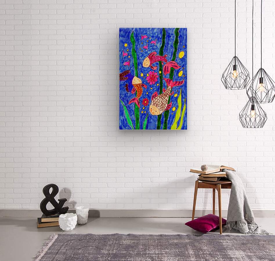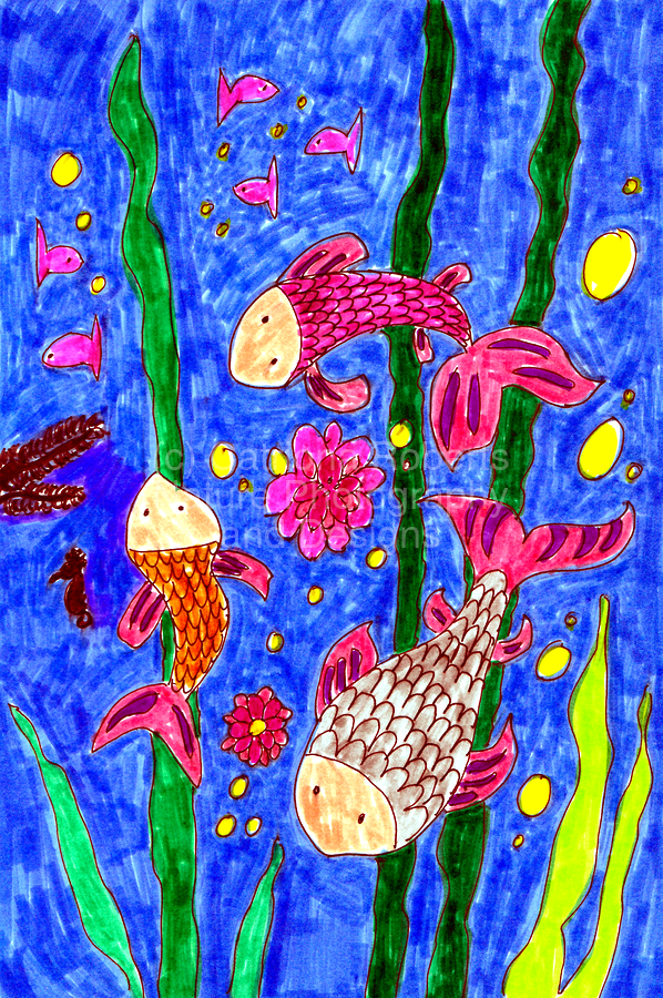 A hand drawn doodle inspired design created using coloured ink pens and paper. Features a lovely grouping of three fist circling around underwater flowers and plants, conveying a sense of movement and energy. Smaller fish swim above them in a playful whimsy manner. The scene is vibrant and colourful .