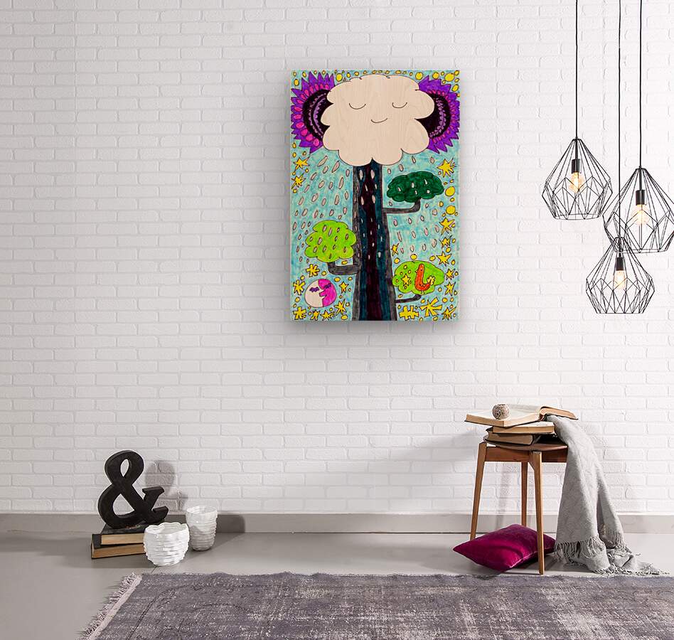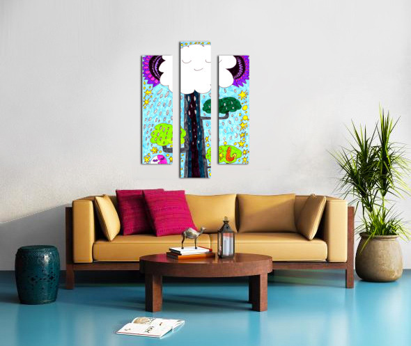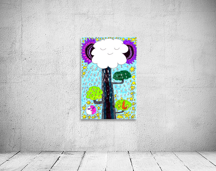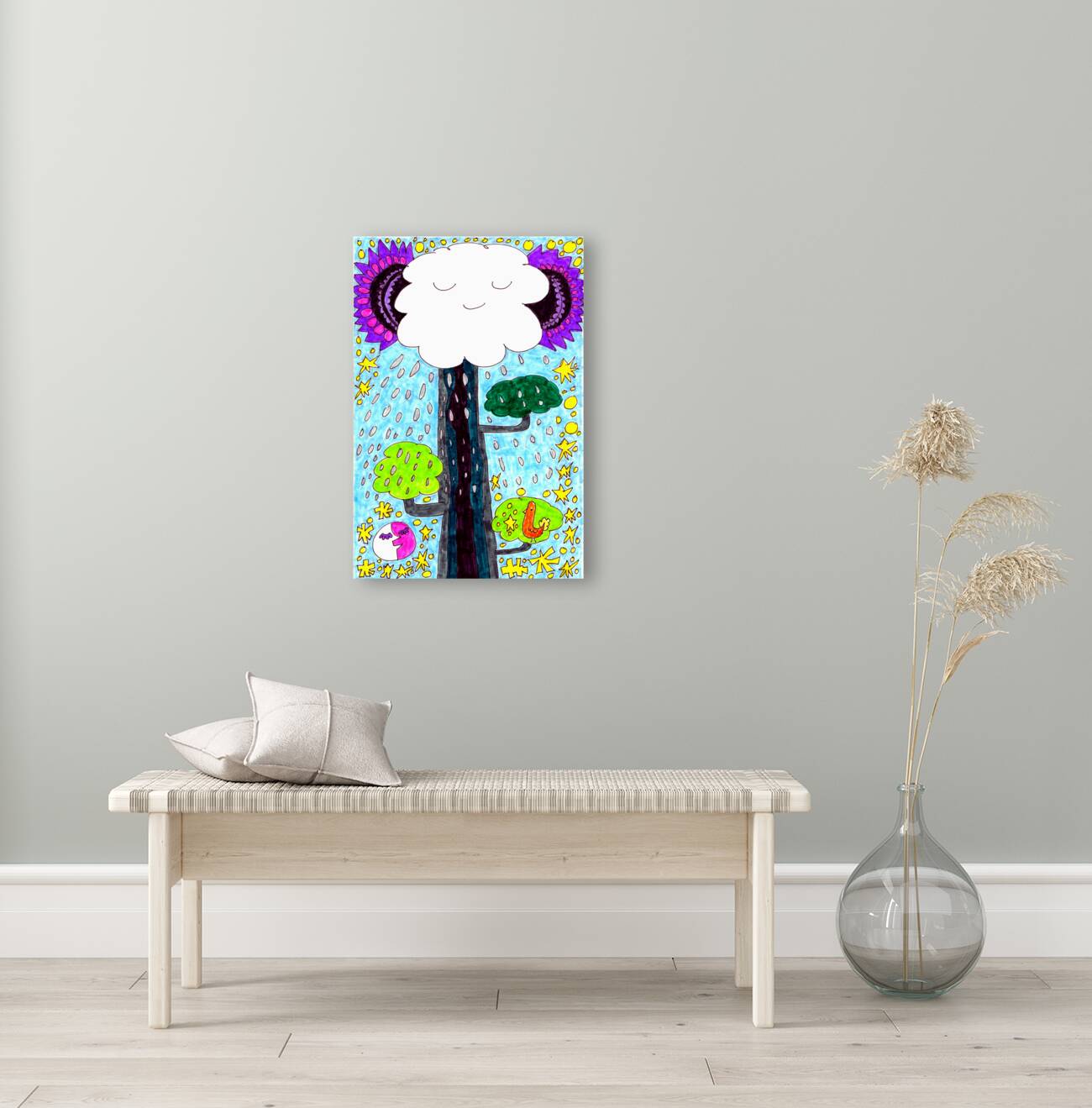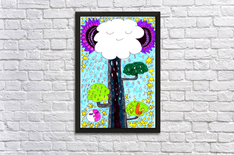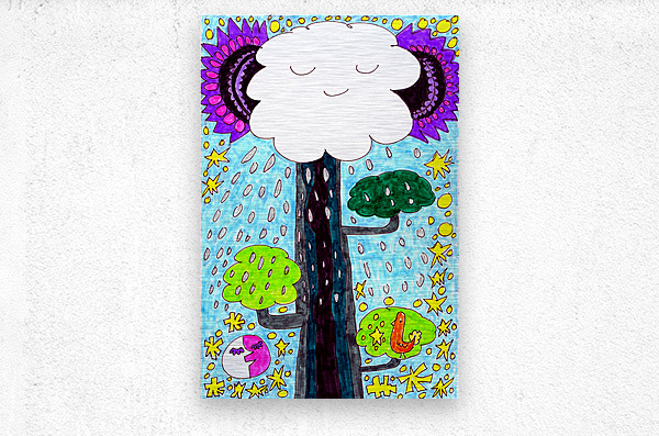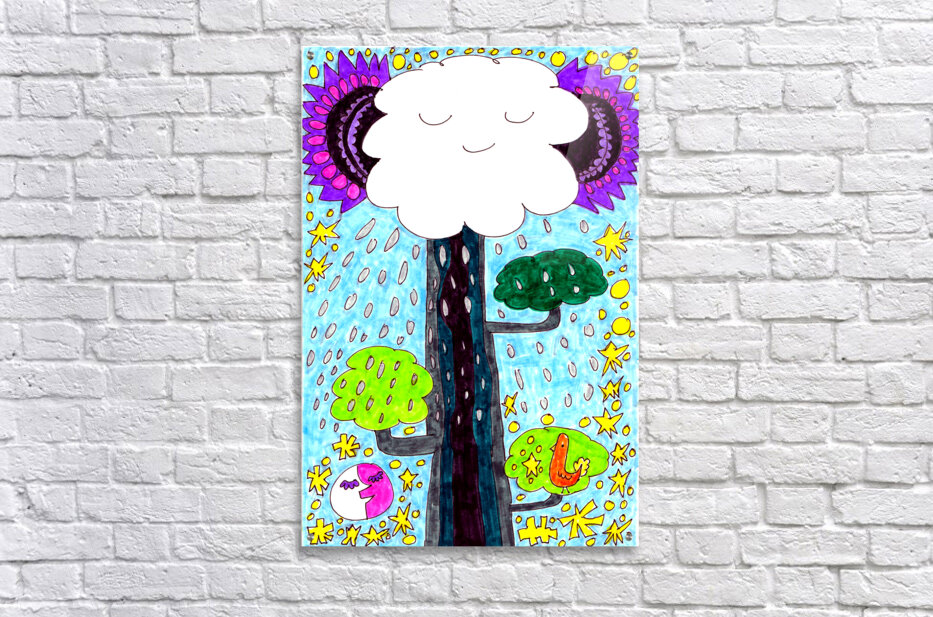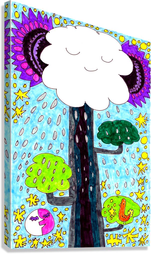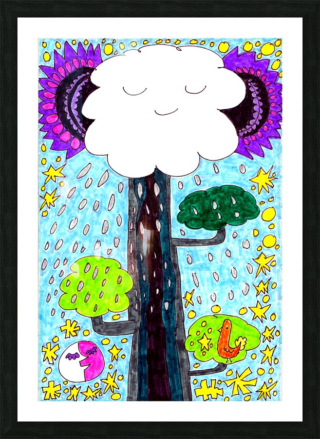 A hand drawn doodle inspired design created using coloured ink pens and paper. Features a tall tree standing amidst a rain cloud as it showers down on the tree leaves below. The blue sky is filled with yellow stars and circles while a colourful sun near the bottom left of the scene, appears to enjoy their company. A cute bird is happily perched on a branch looking on.