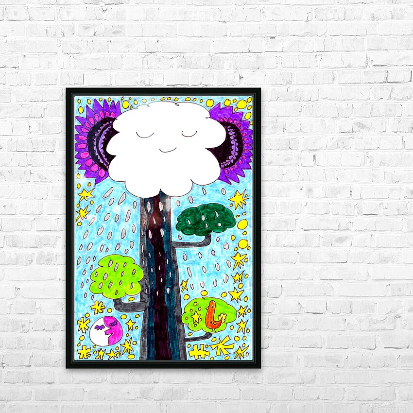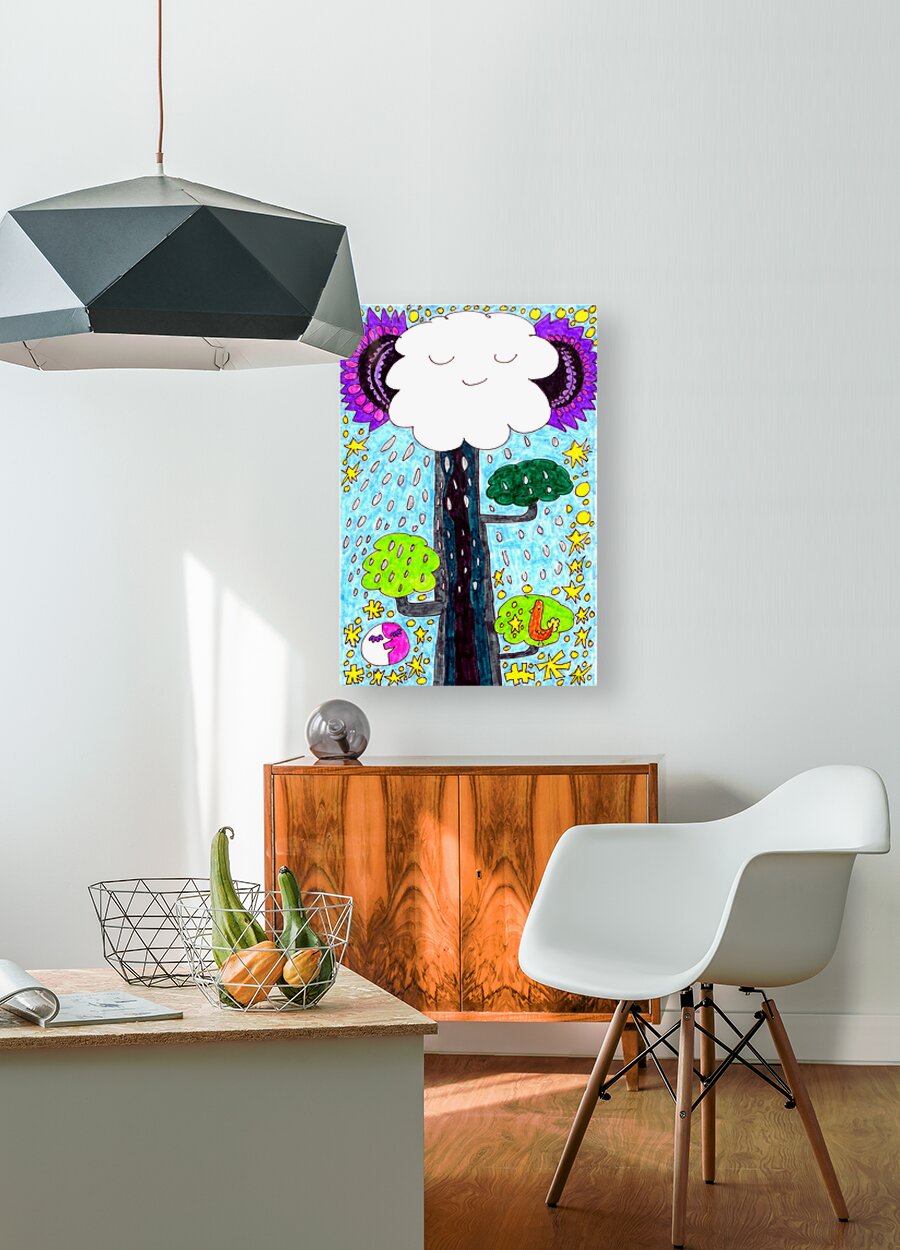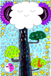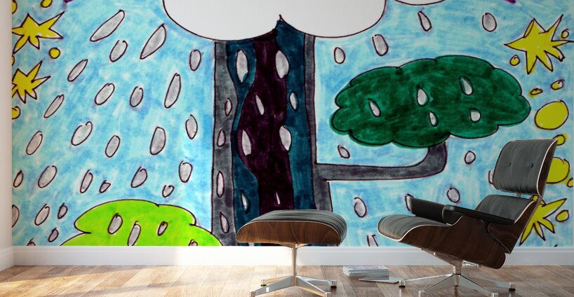 A hand drawn doodle inspired design created using coloured ink pens and paper. Features a tall tree standing amidst a rain cloud as it showers down on...[+]