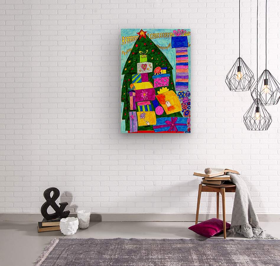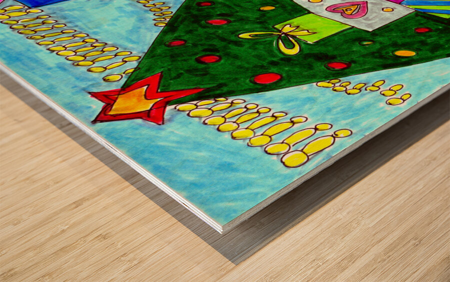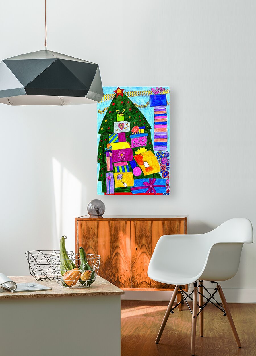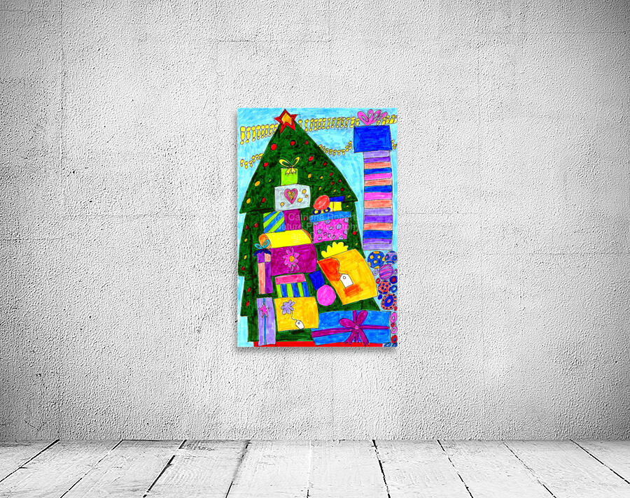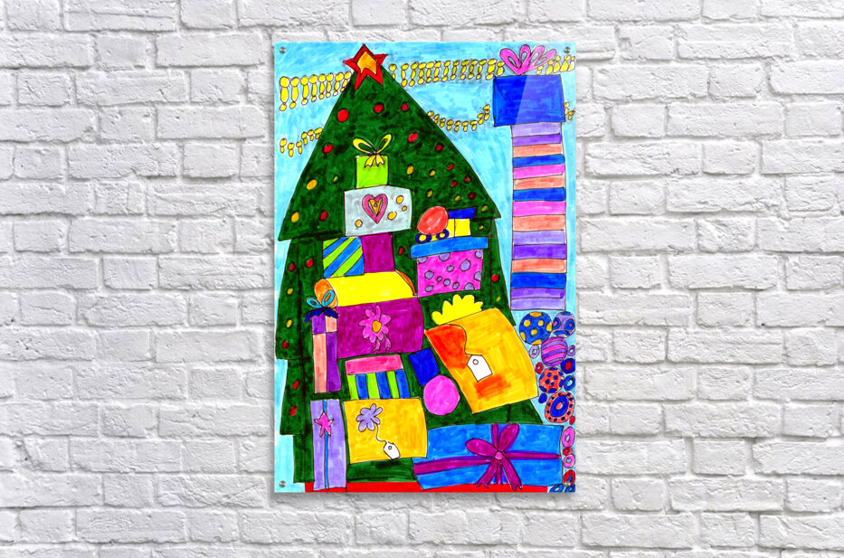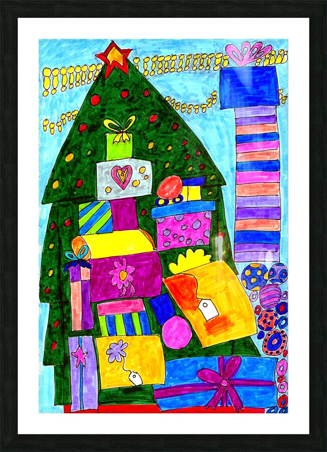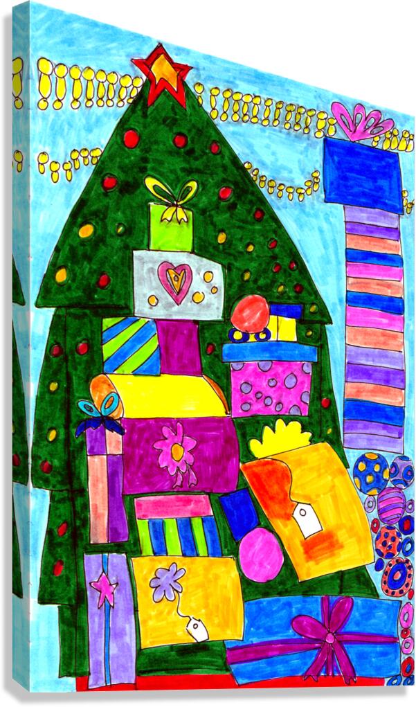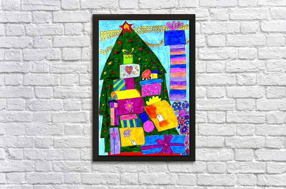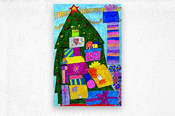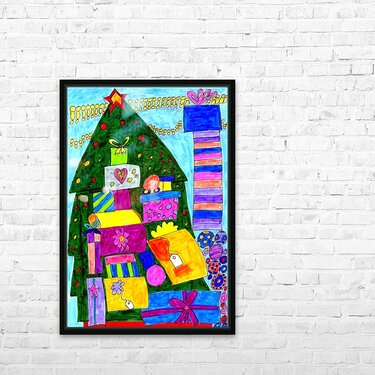 A hand drawn doodle inspired design created using coloured ink pens and paper. Features a centrally positioned large Christmas Tree behind a pile of c...[+]