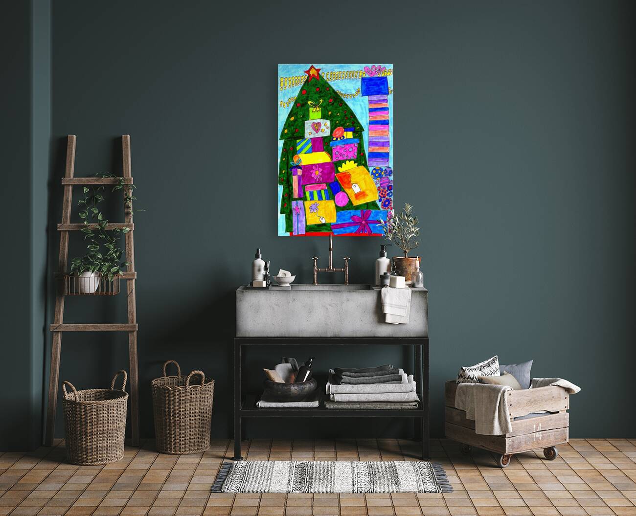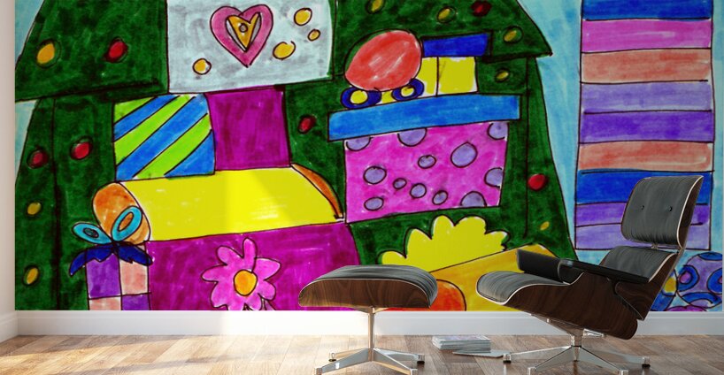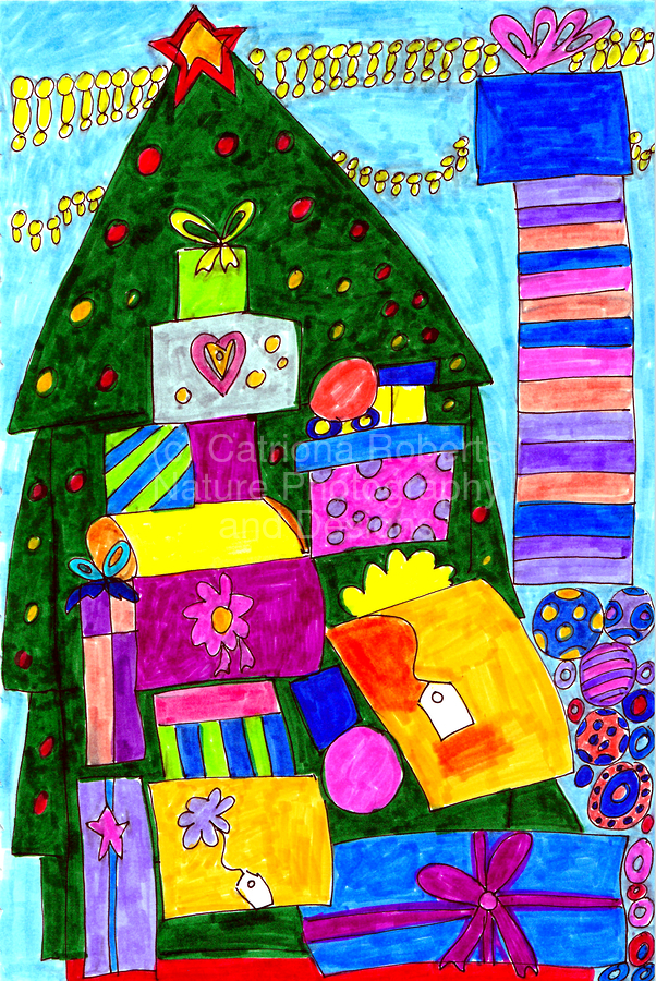 A hand drawn doodle inspired design created using coloured ink pens and paper. Features a centrally positioned large Christmas Tree behind a pile of colourful presents. Each present is individually stylized adding to the sense of whimsy and fun.