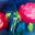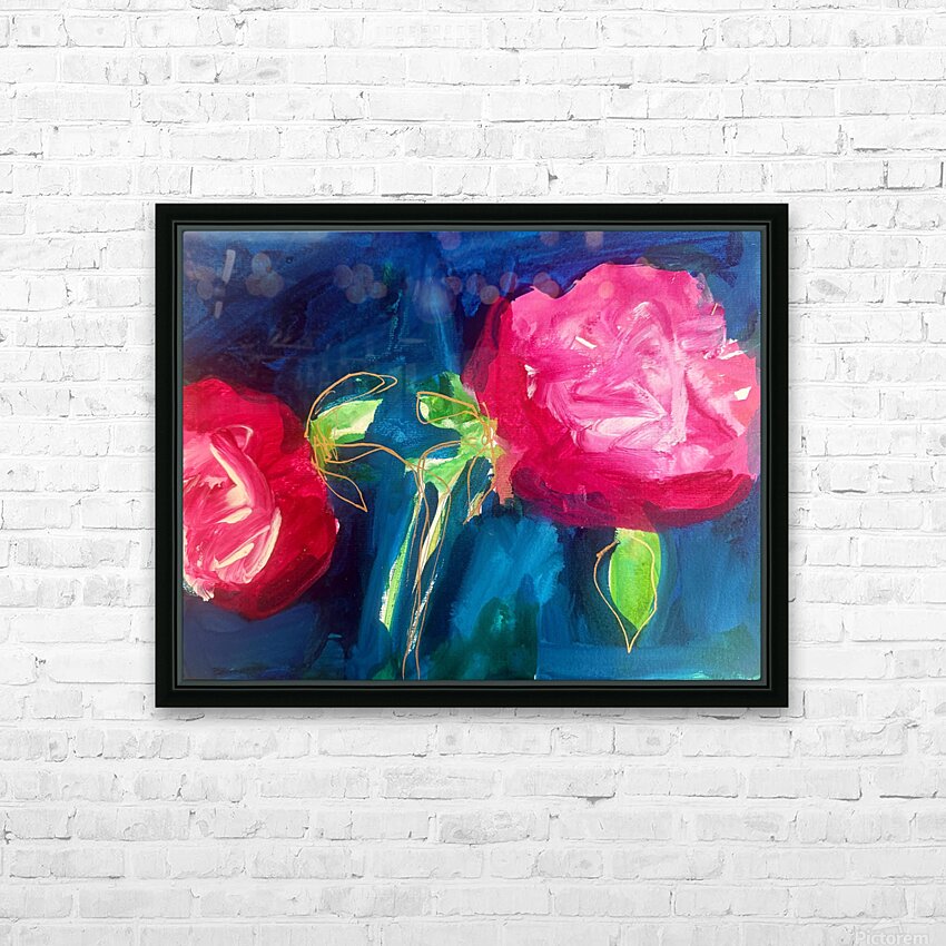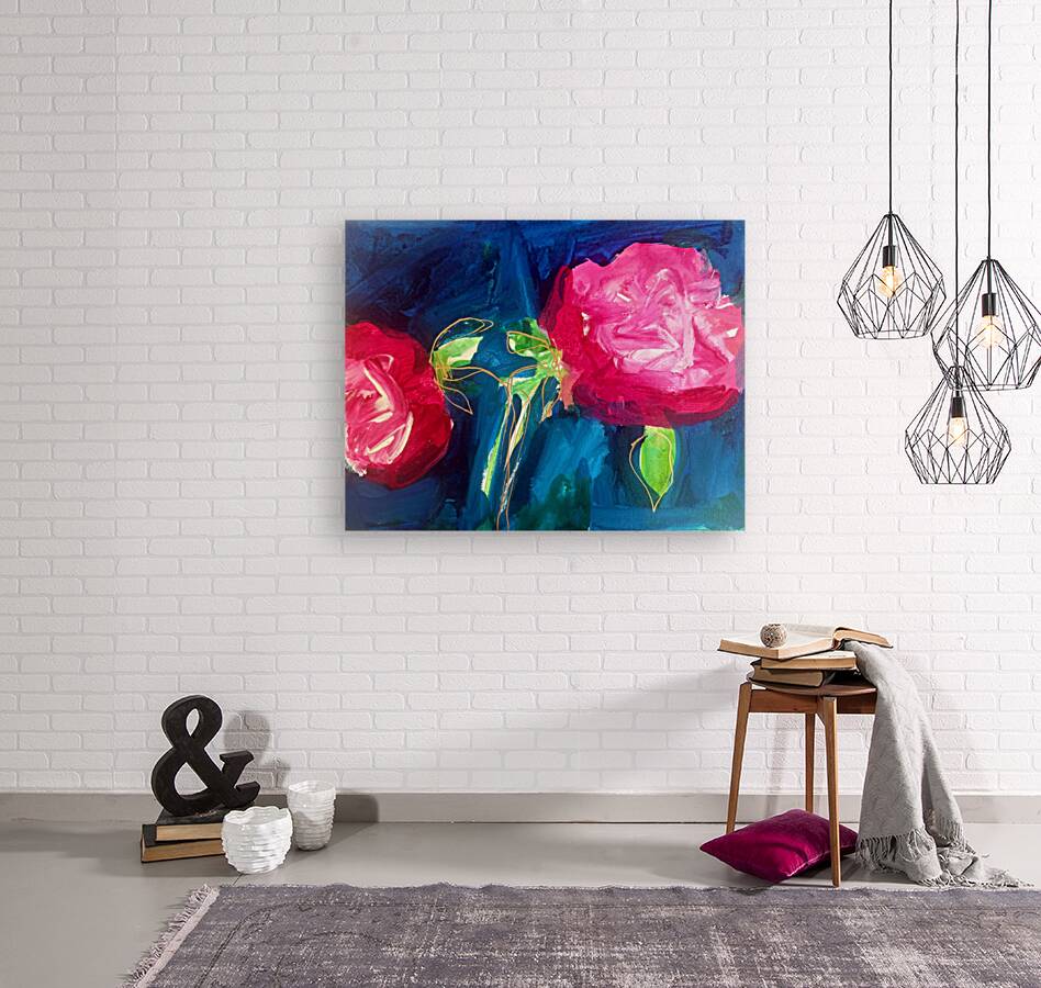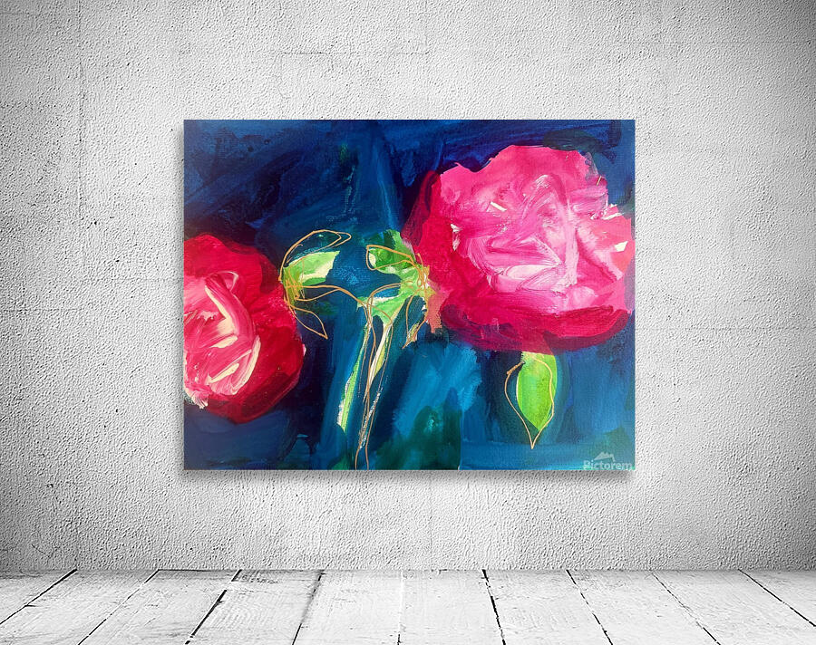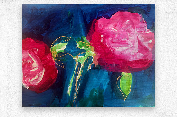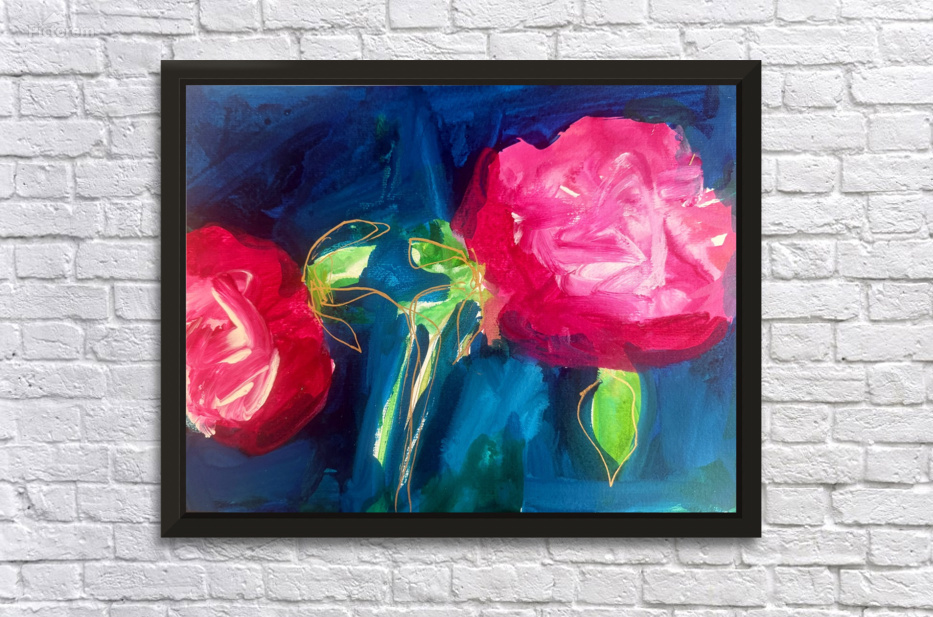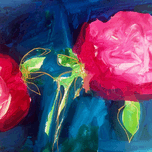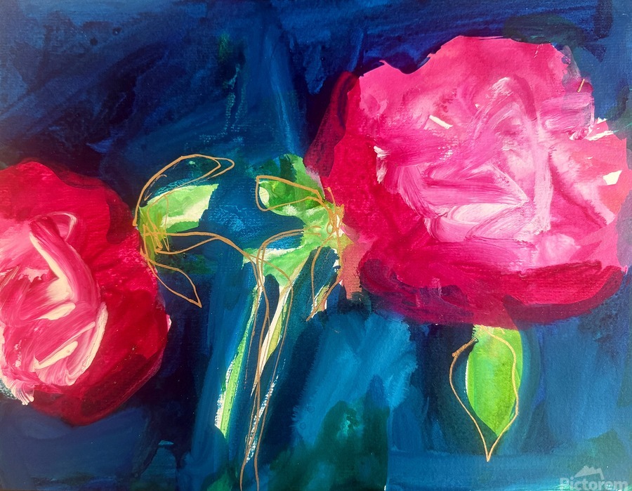 This is a deep blue painting showing two abstract beautiful Pink Roses.