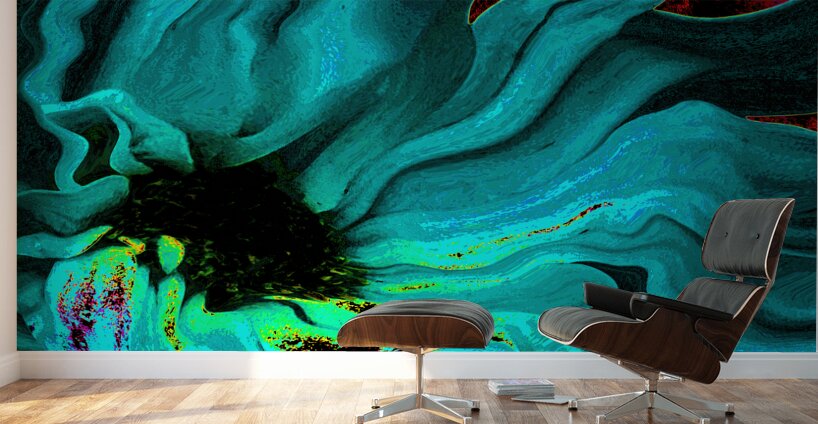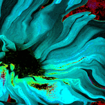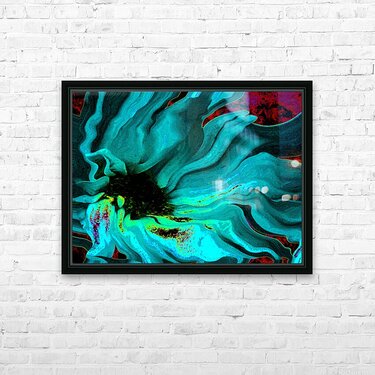 Originally a close up photo of a Daisy flower and an abstract photo of a tree through a rain soaked window, laterally digitally manipulated and combined to create a stunning piece of contemporary floral art. Features a swirling abstract depiction of a Daisy in vibrant blues and greens with hints of red and yellow. The petals appear to be fluid and dynamic, creating a sense of movement and energy.