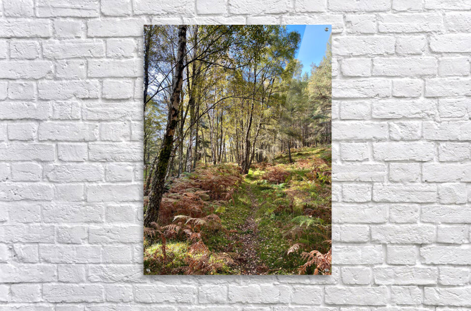 I took this photo during a lovely sunny autumnal walk through the Scottish Highlands. Features sunlight as it filters through a serene Birch forest, illuminating a narrow path surrounded by lush greenery and ferns. Tall Birch trees line the path, casting gentle shadows on the forest floor.