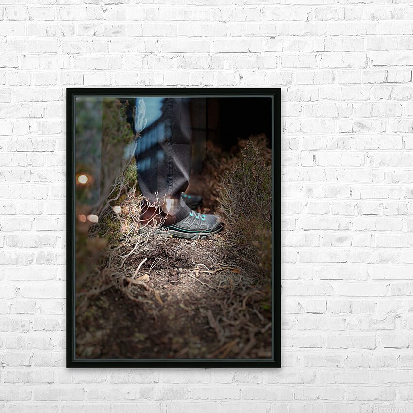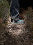 I took this photo during a lovely mild autumnal nature walk through the Scottish Highlands. Features a person standing among dense vegetation, wearing black pants and athletic walking shoes. The ground is covered with dry branches and soil.