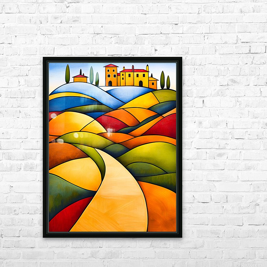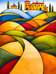 Vibrant geometric shapes form a colorful landscape featuring rolling hills and a quaint village with tall cypress trees atop a hill. A winding path le...[+]