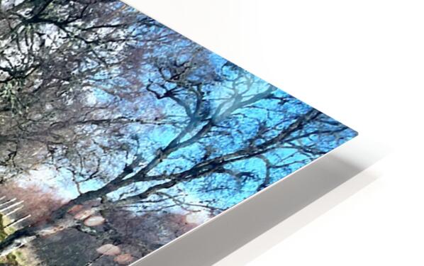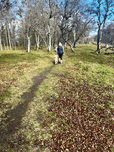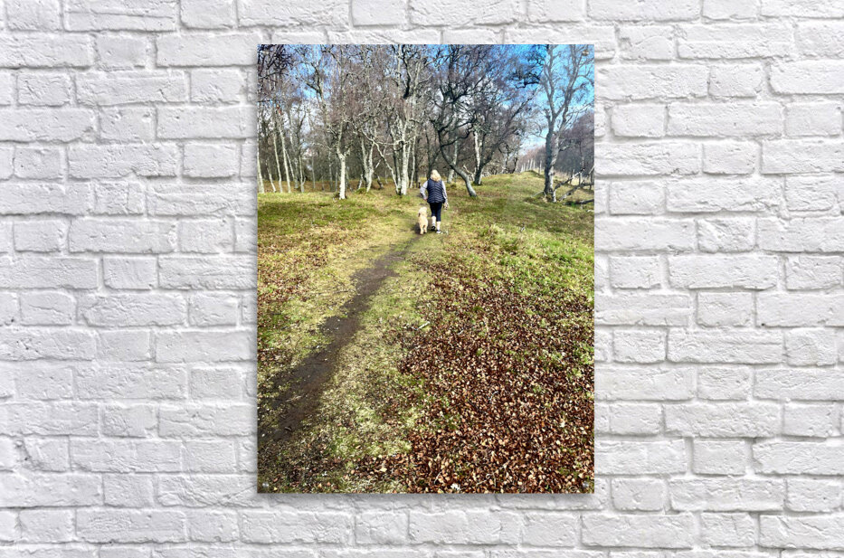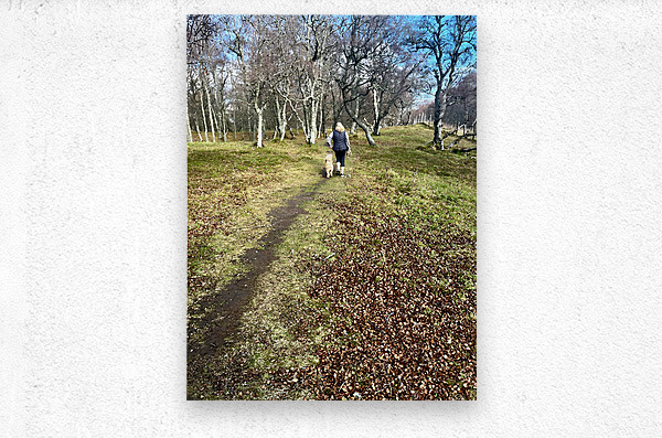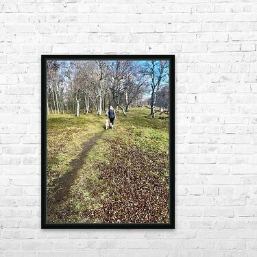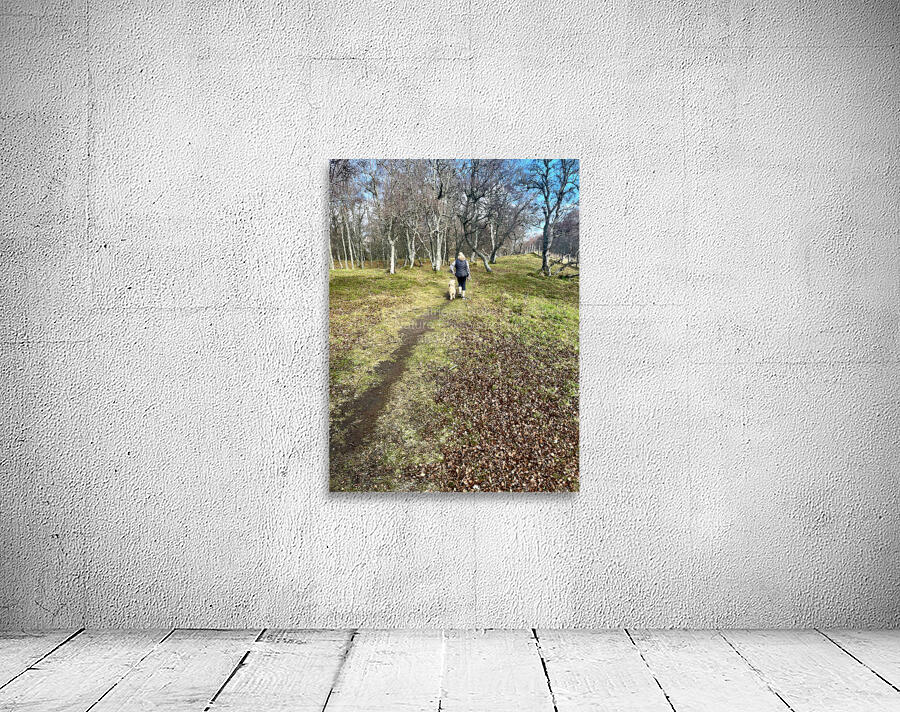 A coloured photo laterally digitally manipulated into an impressionistic design featuring a person walking a dog along a winding autumnal nature path in the Scottish Highlands. The path leads through a wooded area, surrounded by leaf-strewn ground and bare trees. The sky is clear with patches of blue visible through the branches.