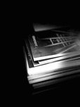 A black and white photo featuring a stack of books dramatically highlighted against a dark background, with light focusing on the topmost book, creating a moody atmosphere. The cover of the book features some text and what appears to be a cosmic design.