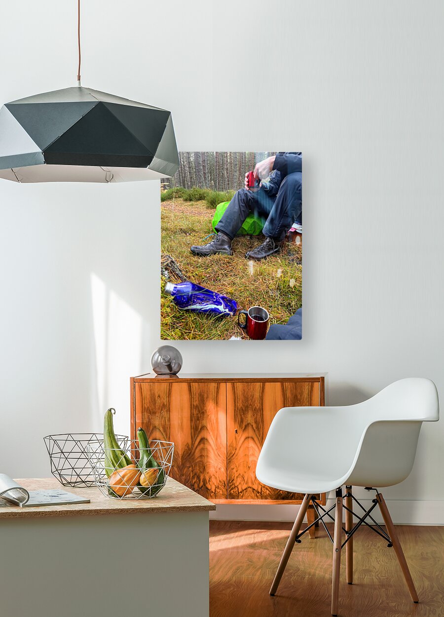 I took this photo during a much needed rest, during a lovely autumnal nature walk through the Scottish Highlands. Features a person seated on a grassy forest floor, taking a break with a red mug in hand. Nearby, a vibrant blue water bottle contrasts with the earthy tones of the surroundings.
