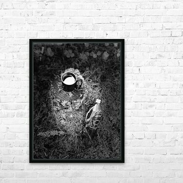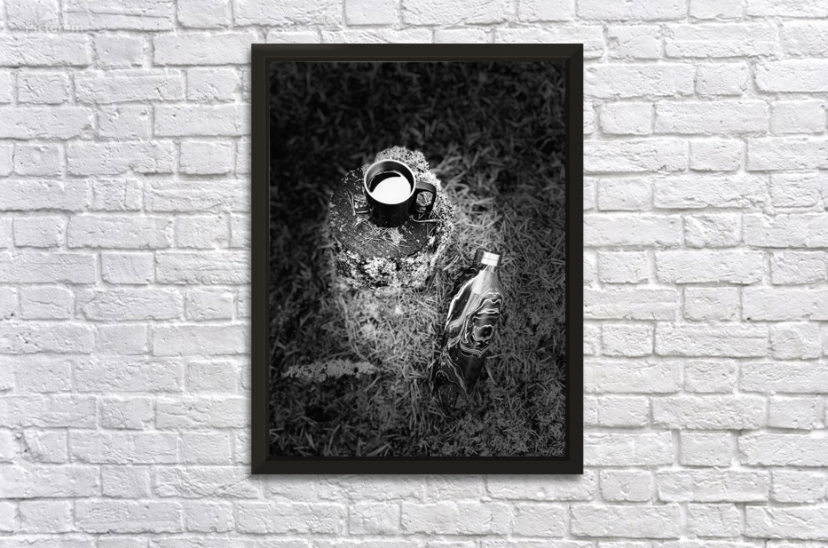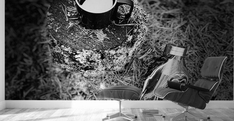 I took this photo during a pit stop on lovely autumnal nature walk through the Scottish Highlands. Features a steaming cup resting on a rough, textured stump, surrounded by grass, while a sleek metal bottle lies nearby. The monochrome setting accentuates the play of light and shadow.