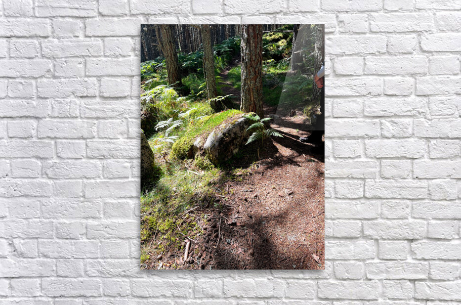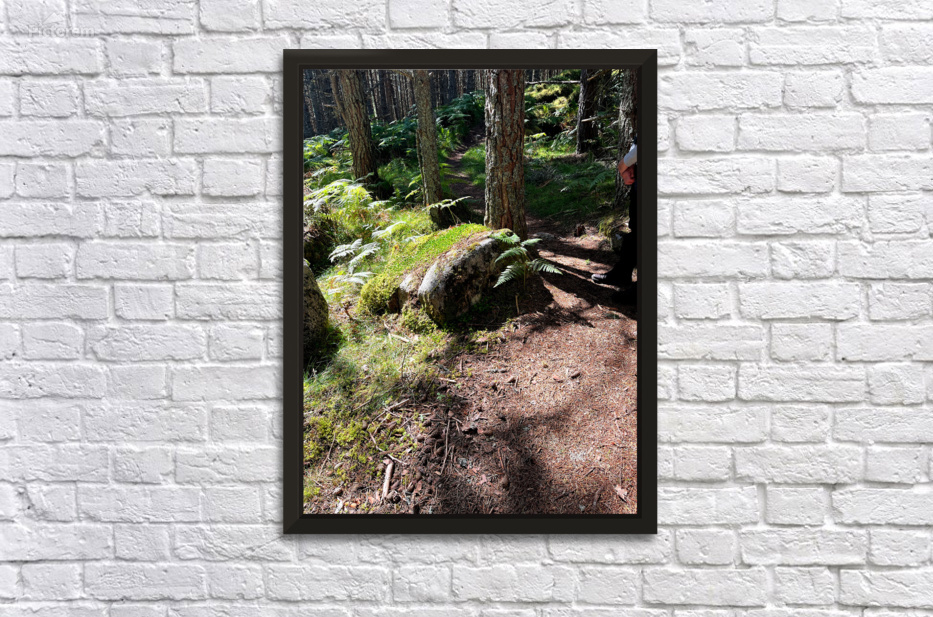 I took this photo during a lovely autumnal nature walk through the Scottish Highlands. Features a forest scene presenting a narrow dirt path winding through the trees, with sunlight casting intricate shadows on the ground. Ferns and moss-covered rocks add vibrant green to the natural landscape. A person stands waiting on the right side of the trail with clasped hands.