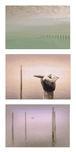 Pensacola Beach triptych in pastel colors on a foggy, mistly, dreamy, morning, old pilings, scenic clouds, a male brown pelican bird and a boat, comp...[+]