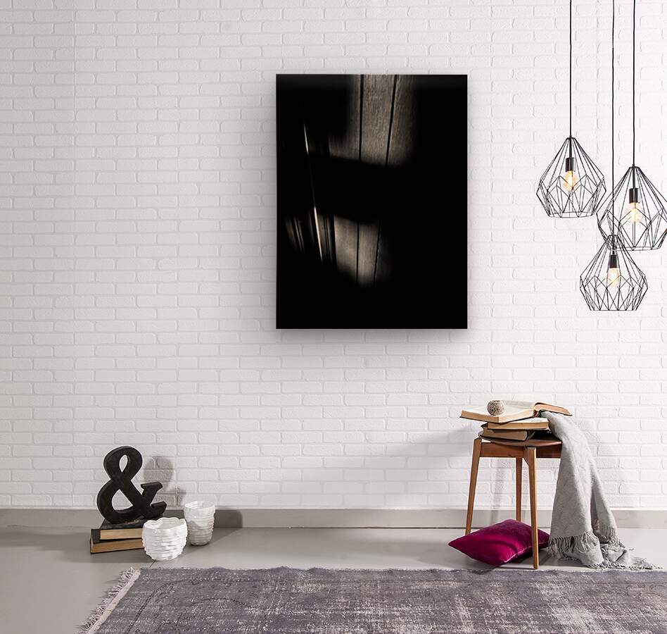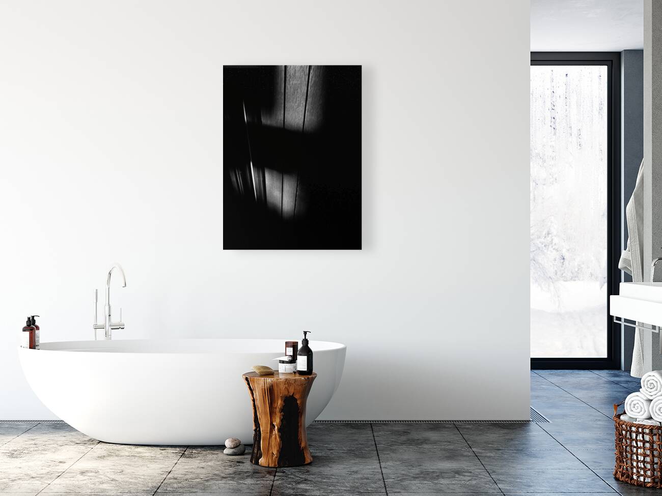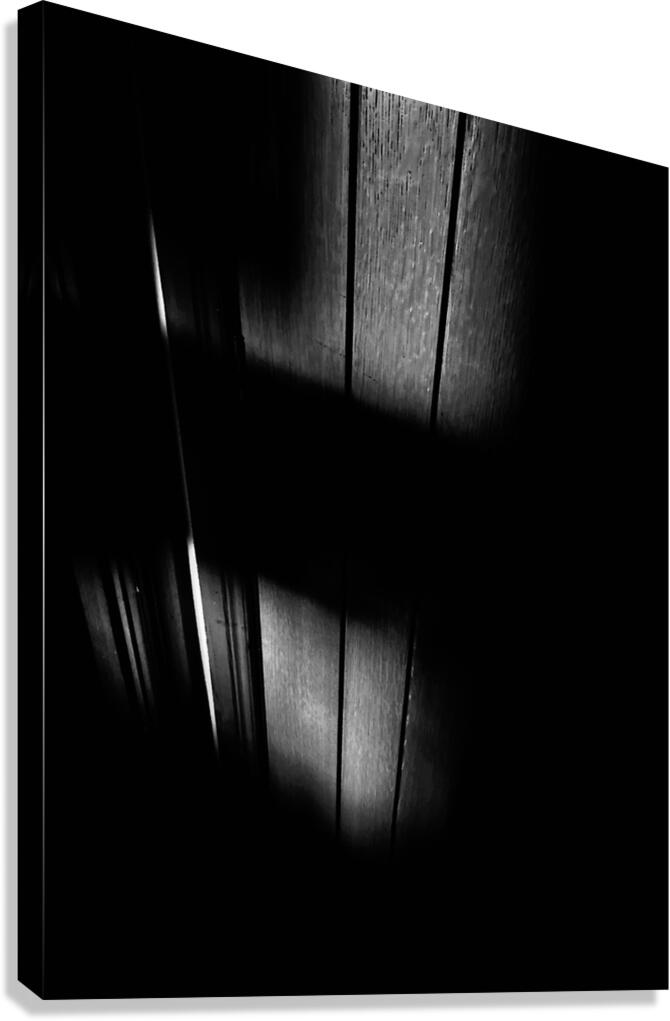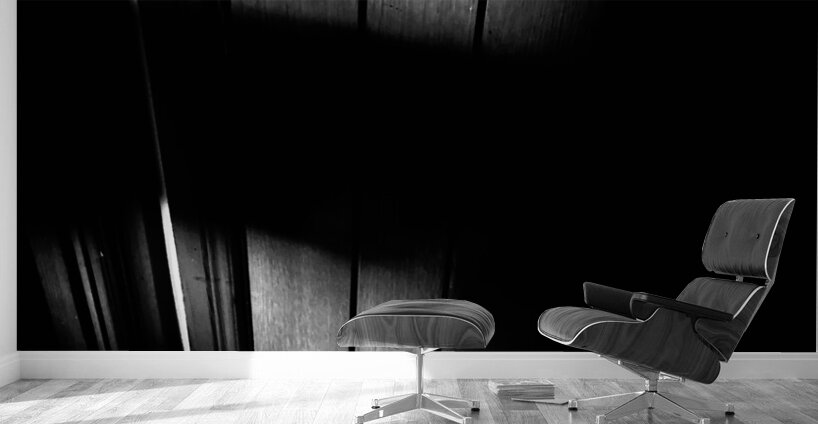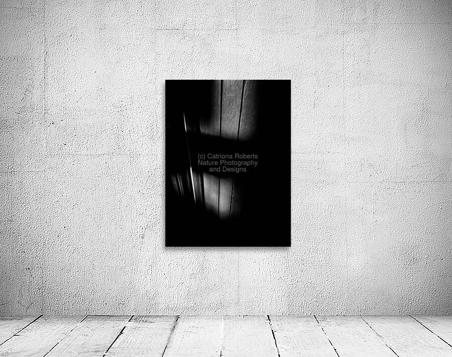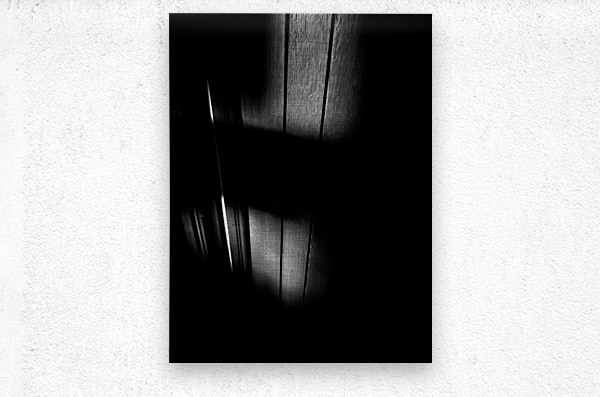 A black and white photo laterally digitally manipulated using an artistic filter, to create a stunning piece of photographic digital art. Features a wooden door with vertical lines interspersed with contrasting lighter areas, creating a stark composition. The interplay of light and shadow gives the image a dramatic and mysterious atmosphere.