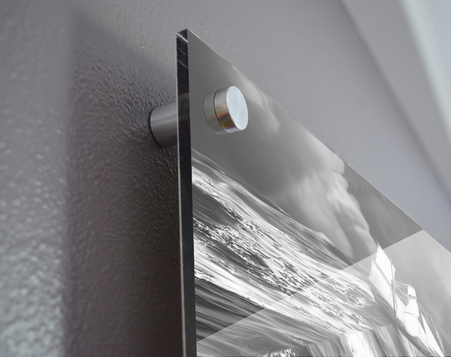 Printed to the edge - Ready to hang - provided with 4 premium polished aluminum stand off ( wall screws and mounting hardware provided )