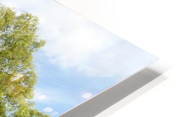 I took this photo during a lovely nature walk through the Scottish Highlands laterally digitally manipulating it into a stunning piece of impressionistic art. Features a lush forest scene with tall, leafy trees under a bright blue sky. Sunlight filters through the branches, creating a serene and vibrant atmosphere.