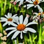I took this photo using a creative photographic filter. Features white summer daisies with vibrant yellow centers surrounded by grasses and small pin...[+]