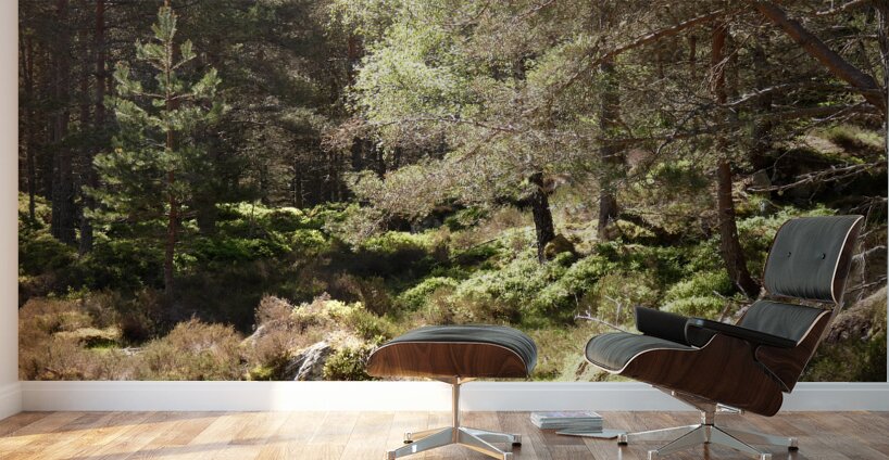 I took this photo during a lovely nature walk through the Scottish Highlands. Features sunlight filtering through the dense forest canopy, illuminating patches of lush greenery on the forest floor. The scene is serene and tranquil, with a mix of Pine and other trees creating a natural tapestry.