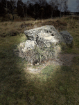 I took this photo during a lovely autumnal nature walk through the Scottish Highlands. Features a large, weathered rock sitting surrounded by patches of grass on a sunlit grassy field. The terrain is uneven, with shadows suggesting nearby trees or bushes.