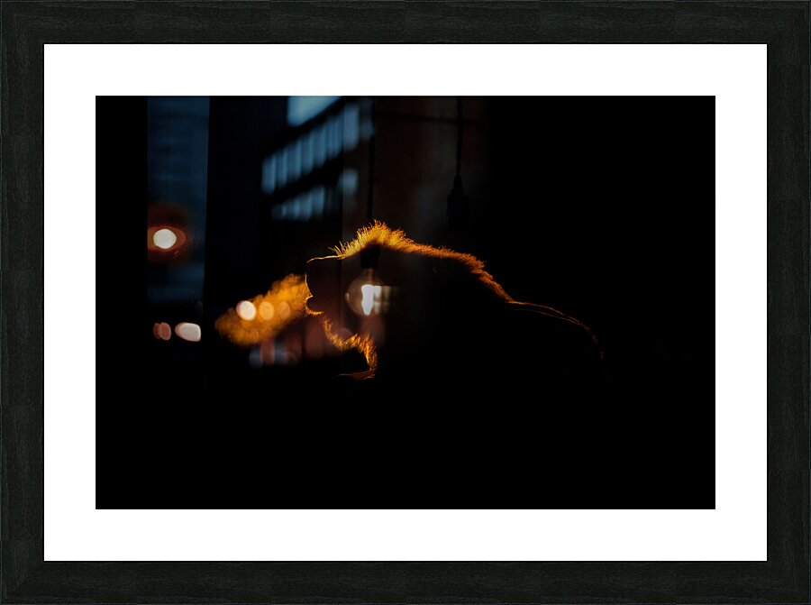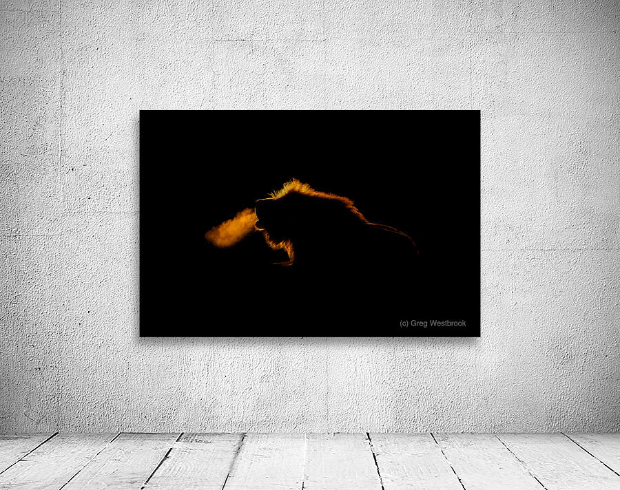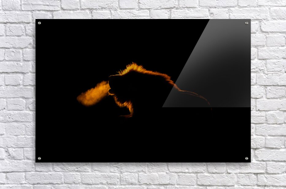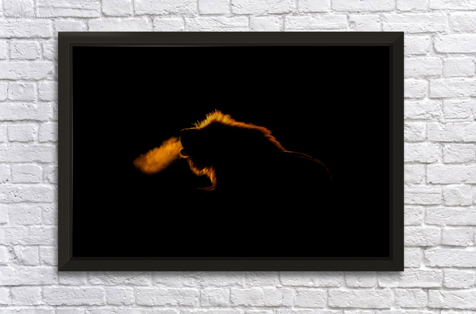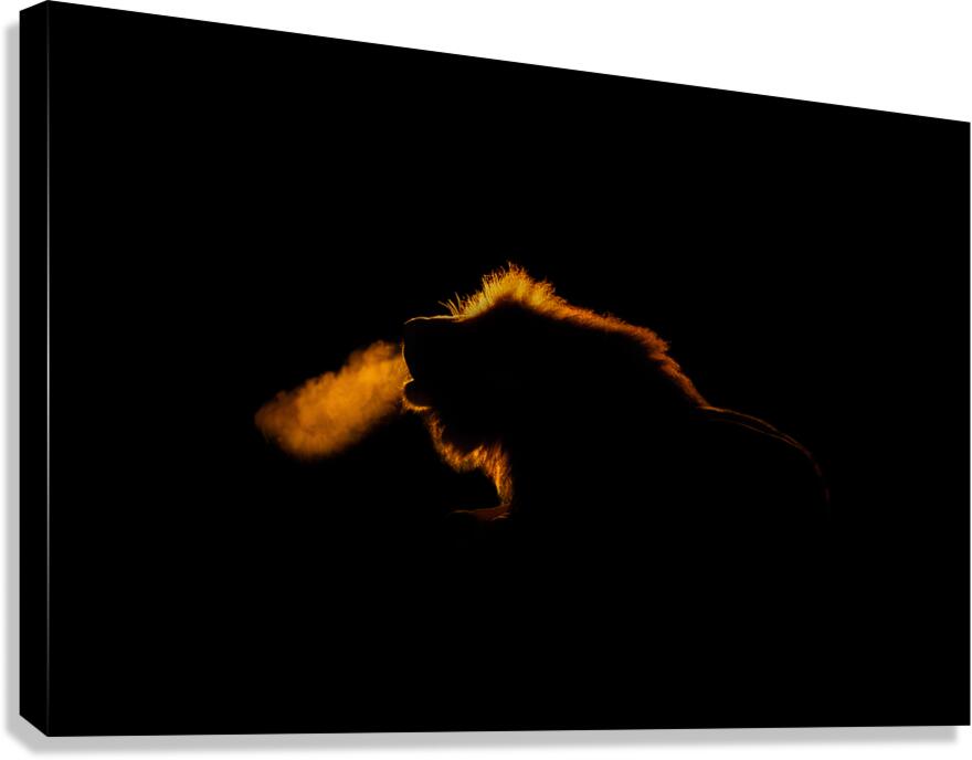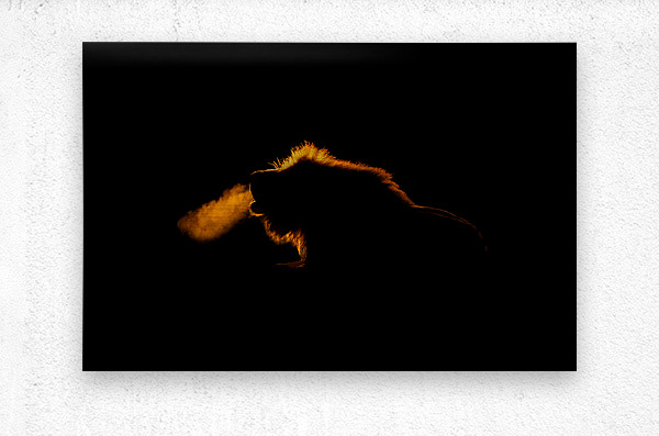 Under a cloak of darkness the lion’s fierce silhouette emerges his mane ablaze with backlight casting an otherworldly glow. Each breath visible the power of his roar seems to break through the shadows a reminder of his undying rule over the night.