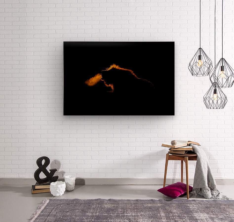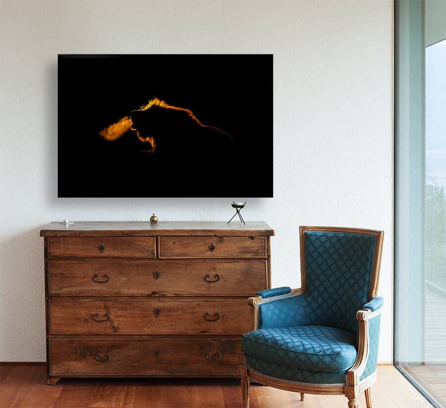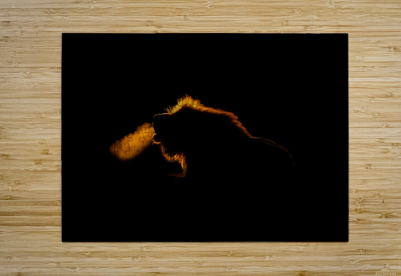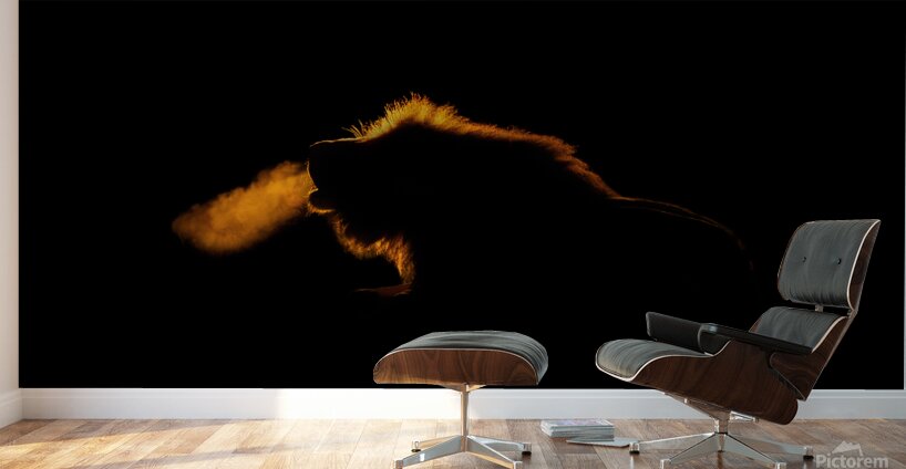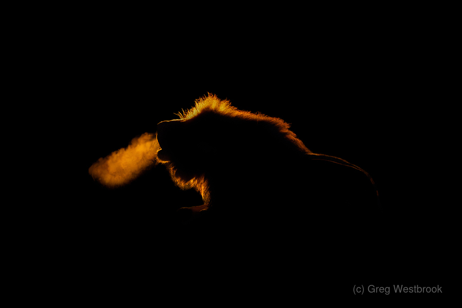 Under a cloak of darkness the lion’s fierce silhouette emerges his mane ablaze with backlight casting an otherworldly glow. Each breath visible the power of his roar seems to break through the shadows a reminder of his undying rule over the night.