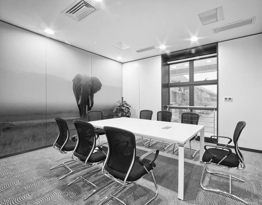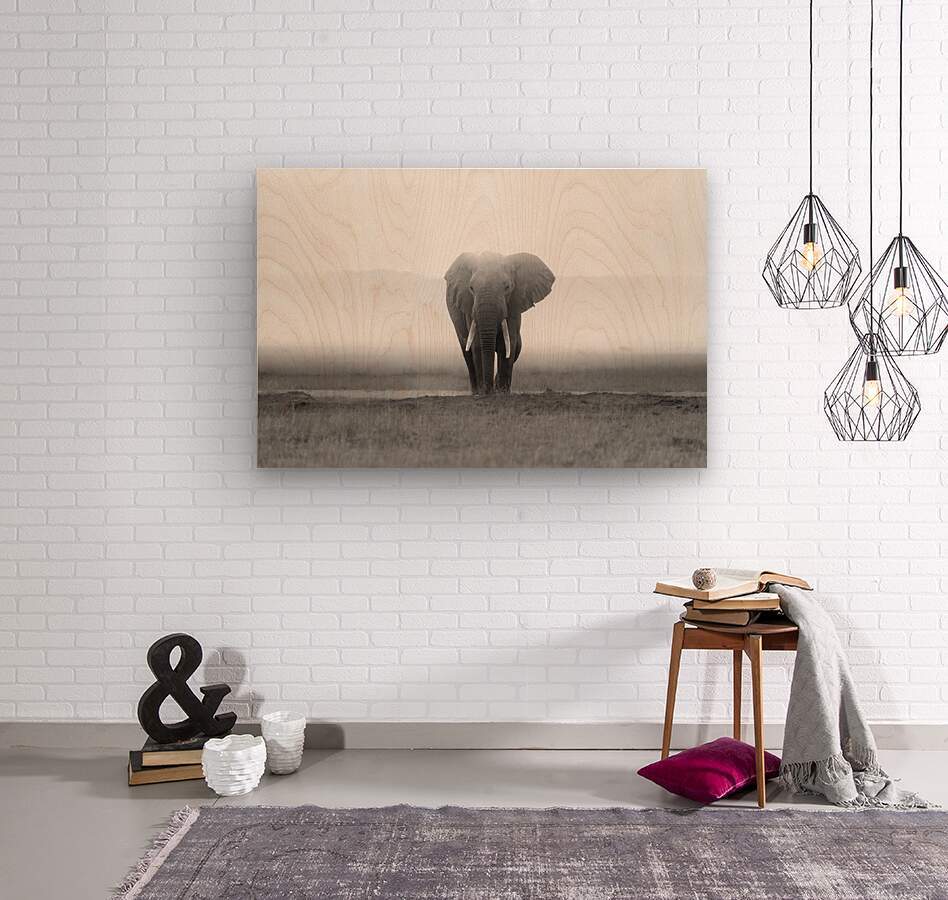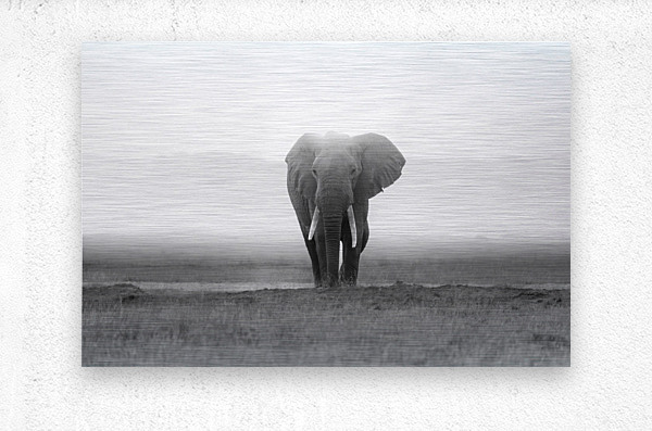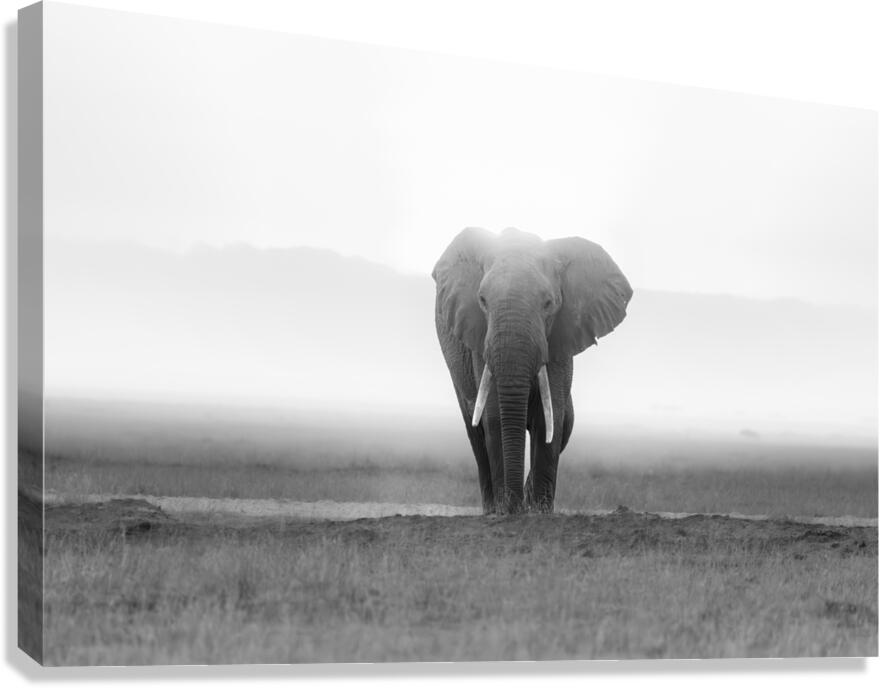 An elephant emerges from the morning mist in this powerful black-and-white composition embodying the quiet strength and dignity that defines these magnificent creatures.