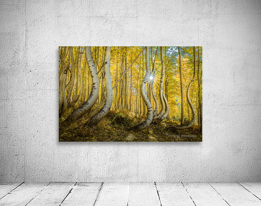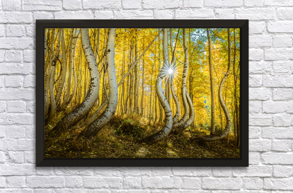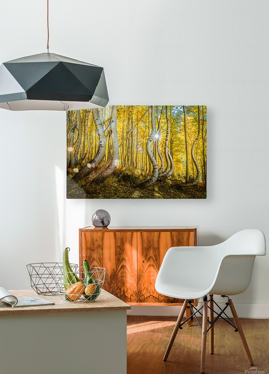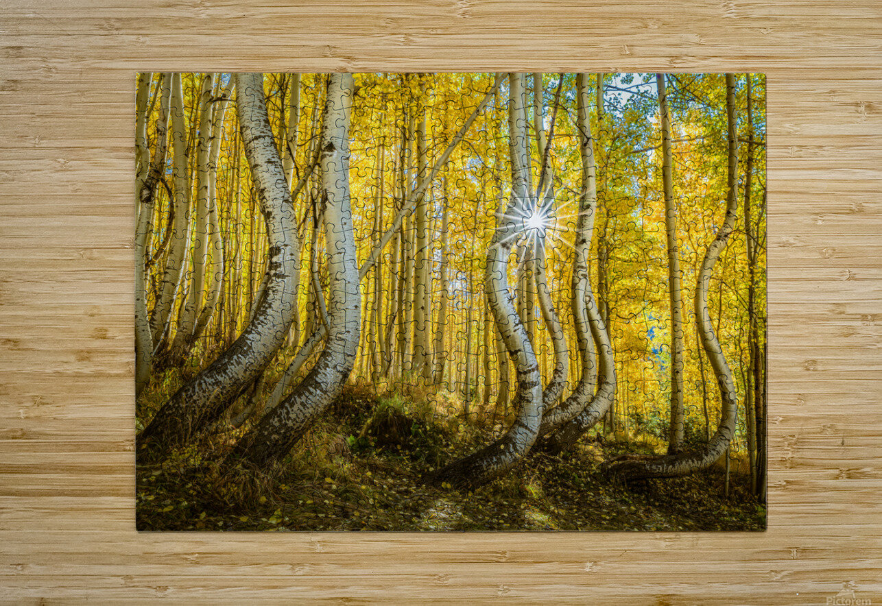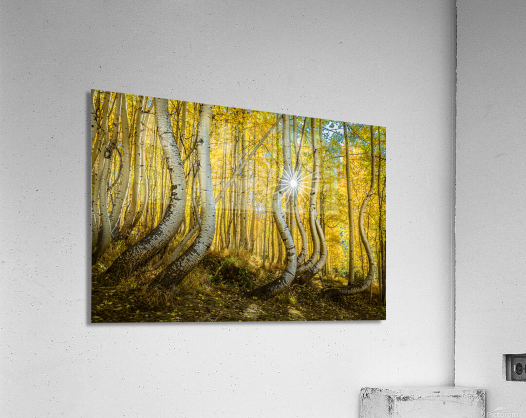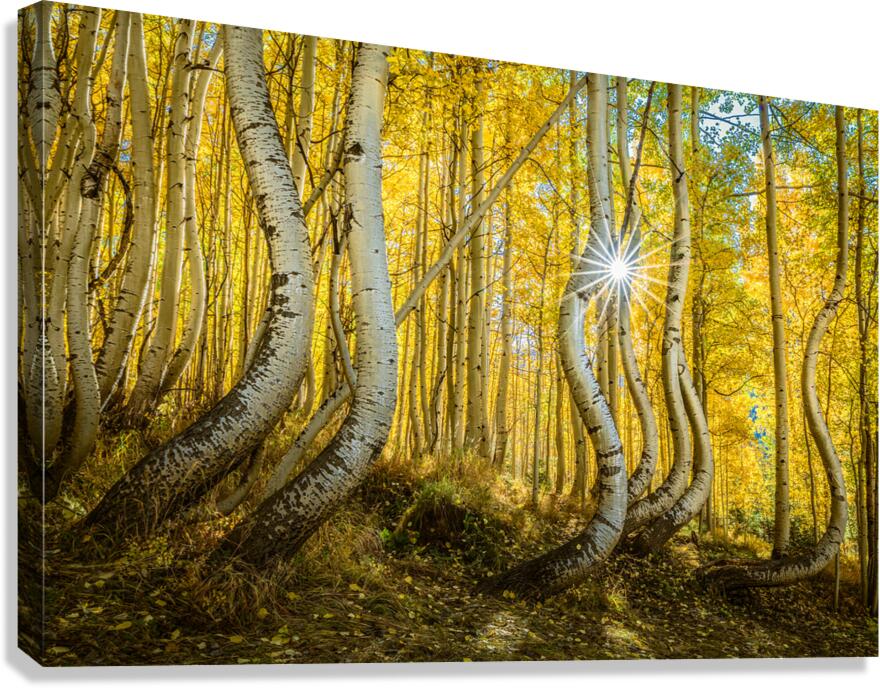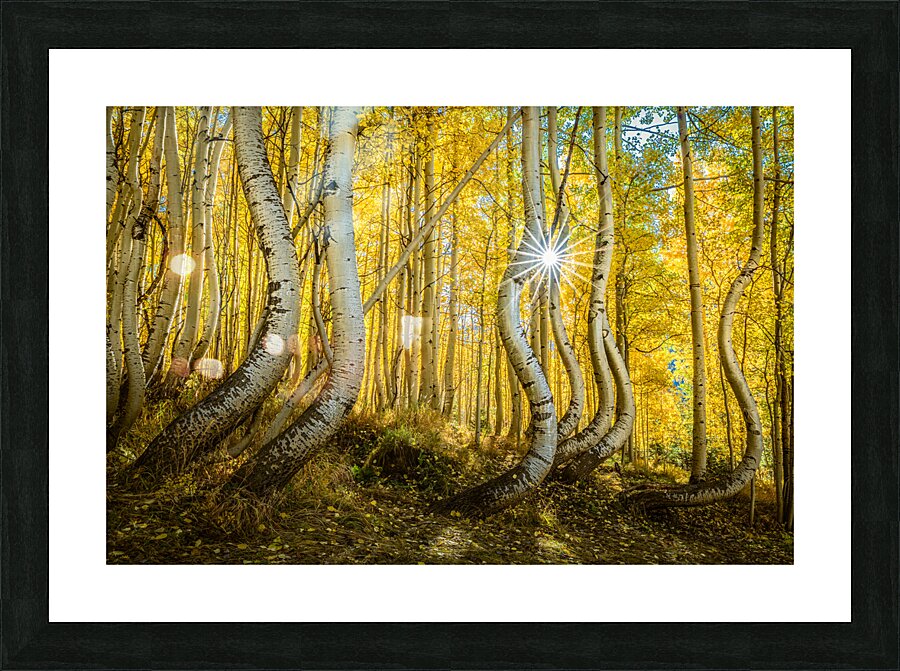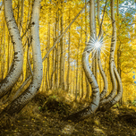 A radiant sunburst filters through an enchanting aspen forest casting golden hues across the twisted trunks and delicate leaves. The playful curves of the trees seem to dance in the autumn light creating a magical almost surreal scene in nature’s sanctuary.