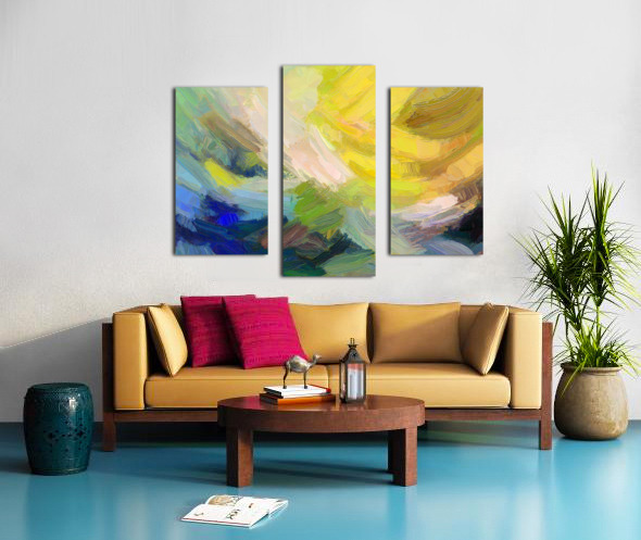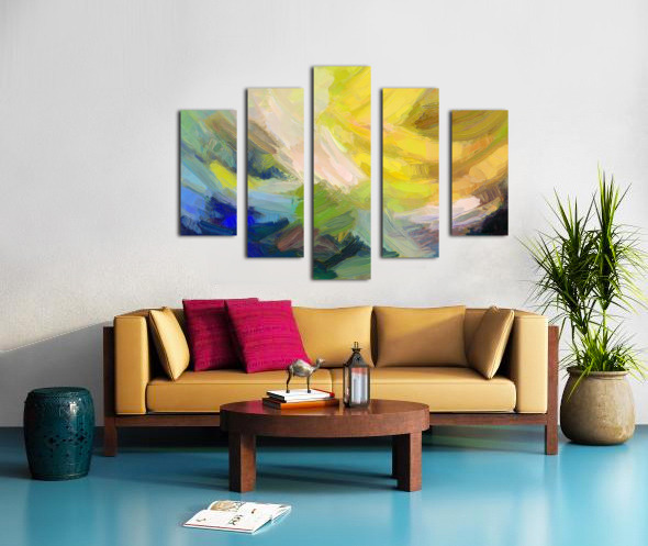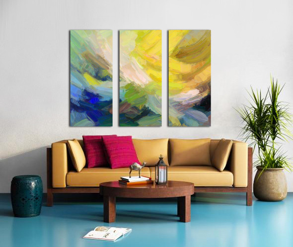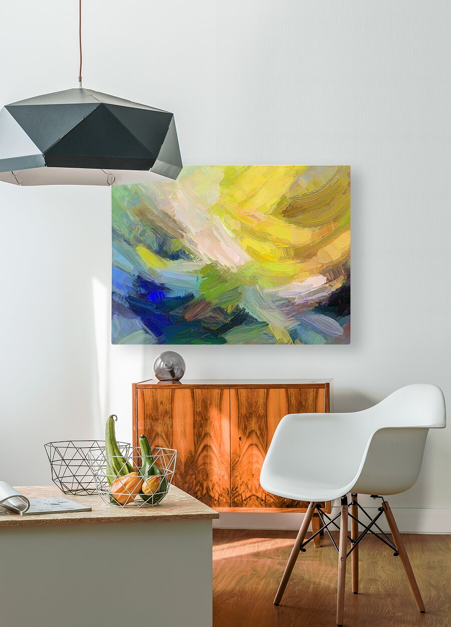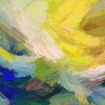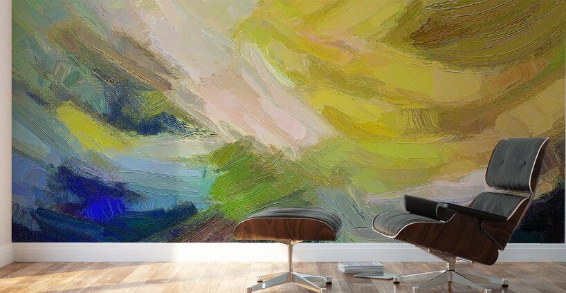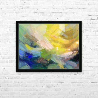 Vibrant brush strokes create a swirling composition of colors with dominant shades of yellow blue and green blending seamlessly together. The dynamic ...[+]