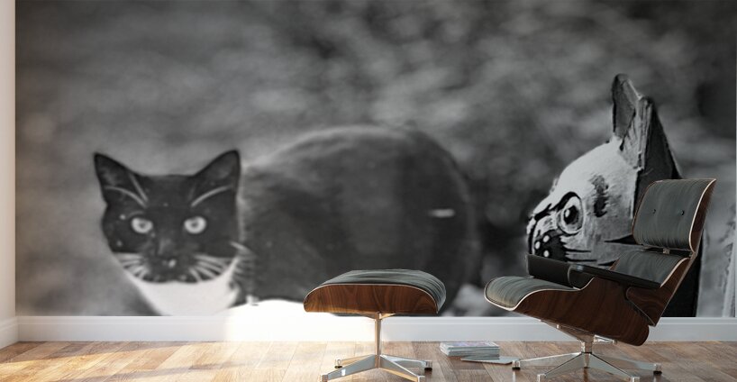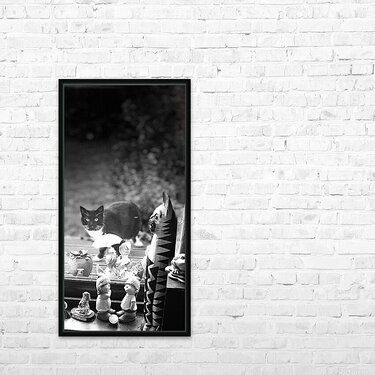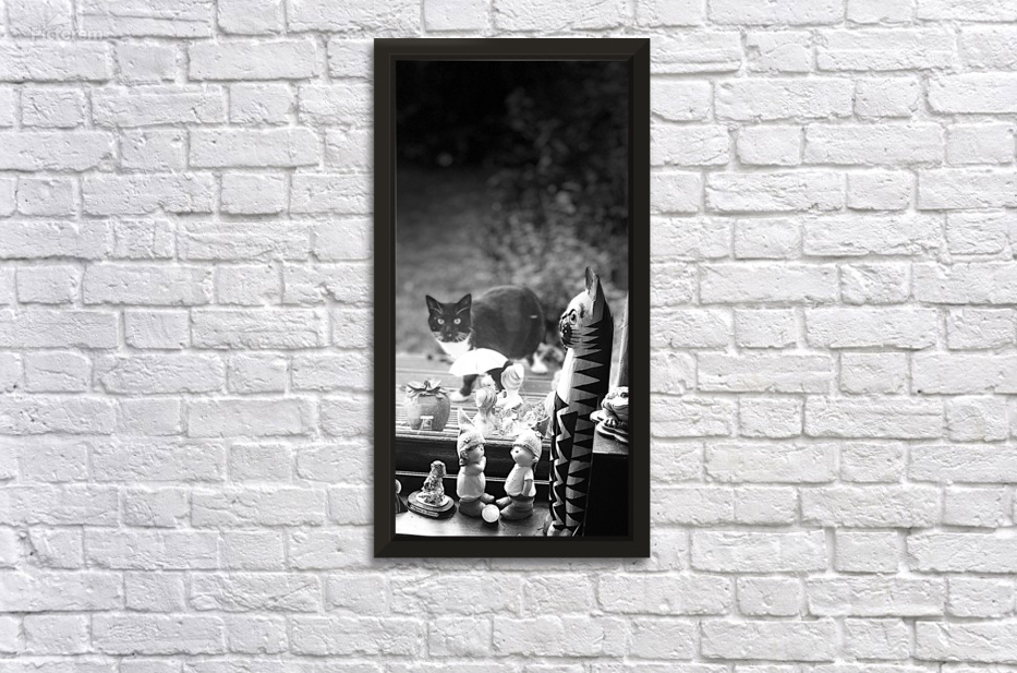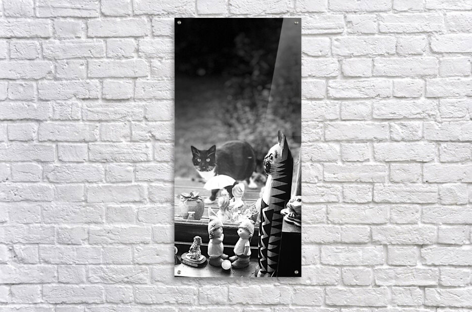 A monochrome photo featuring a black and white cat with striking eyes observes quietly from outside a window. Various small figurines and trinkets lin...[+]