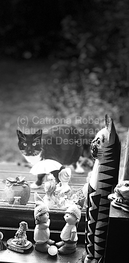 A monochrome photo featuring a black and white cat with striking eyes observes quietly from outside a window. Various small figurines and trinkets line the window sill, adding a whimsical touch to the scene. The blurred background suggests a garden setting beyond the window.