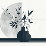 Two vases containing delicate elongated branches and leaves are positioned against a backdrop with a semi-circular shape. The composition combines sim...[+]