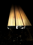 A coloured photo featuring three wooden planks with a worn, striped pattern standing out against a dark background, creating a dramatic focus. The ends of the planks show signs of chipping, adding a touch of character.