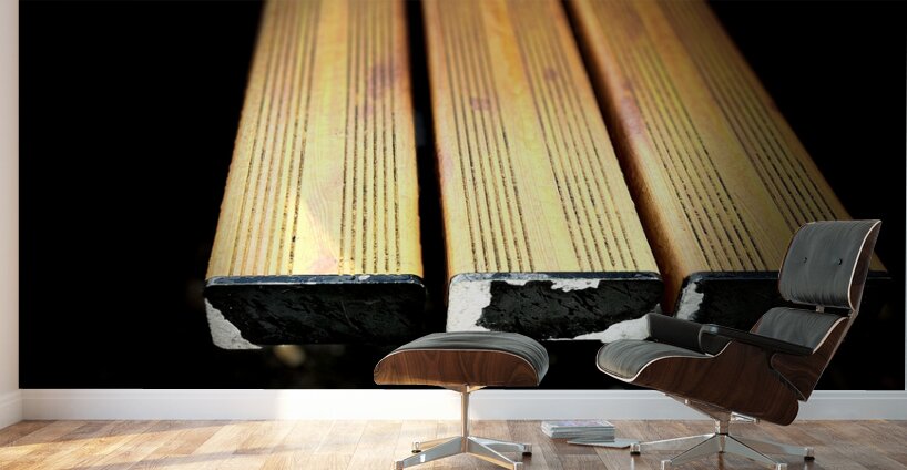 A coloured photo featuring three wooden planks with a worn, striped pattern standing out against a dark background, creating a dramatic focus. The end...[+]