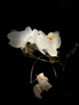 A coloured photo featuring delicate white orchids elegantly illuminated against a dark background, highlighting their pristine petals and intricate structure. A few wilted flowers hang below, adding contrast and depth to the scene.
