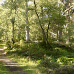 I took this photo during a lovely summer nature walk through the Scottish Highlands. Features sunlight filters through a lush, green Birch forest, casting dappled shadows on a narrow single track path that winds through the trees. The scene is serene and inviting, highlighting the natural beauty and tranquillity of the woodland setting.