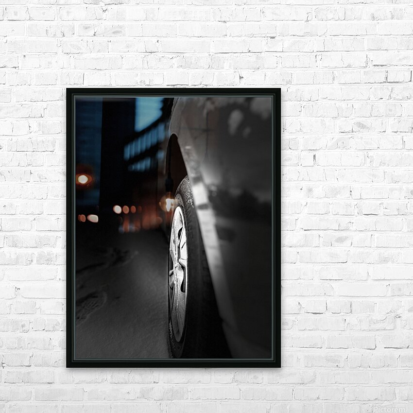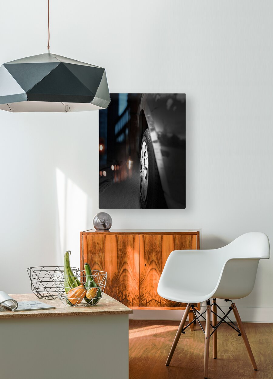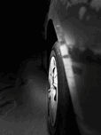 I took this photo during a cold winter morning in the Scottish Highlands. Features a close-up view of a car wheel in black and white, with its body reflecting faint light in a dark setting. The ground appears to be covered with a layer of snow or frost, suggesting a cold environment.