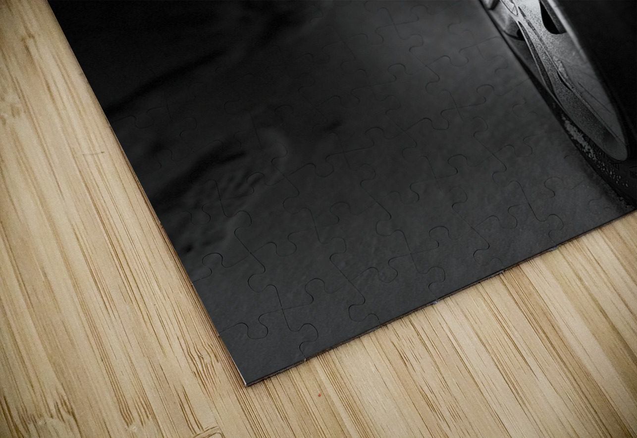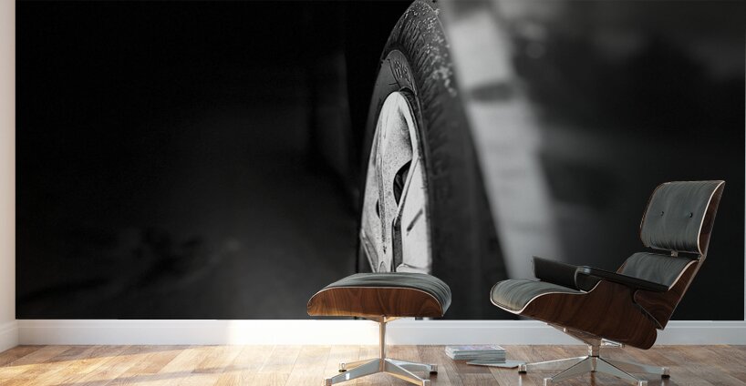 I took this photo during a cold winter morning in the Scottish Highlands. Features a close-up view of a car wheel in black and white, with its body re...[+]