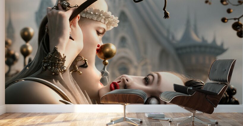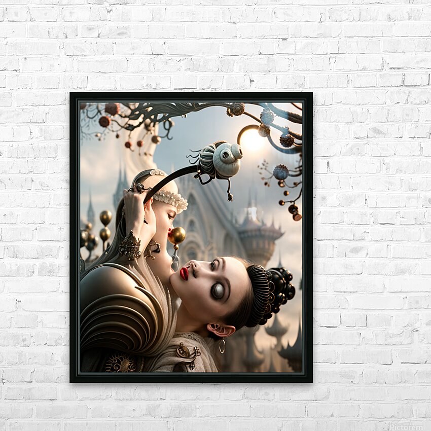 In a world where reality dances with the surreal the scene unfolds like a dream woven from shadows and whispers. Two figures emerge their forms exquisitely intricate each a study in contrasts and connections. One draped in elegant curves presents an aura of grace and strength. Her skin glimmers softly adorned with pearls that seem to catch the fleeting light reflecting a sense of regality. Beside her another figure draws closer a delicate tension hanging between them. This woman possesses striking features her lips painted in bold crimson contrasting against the pale backdrop of her companion. Their gazes intertwine a silent conversation flowing like a river between them—a yearning for understanding or perhaps an echo of past secrets. Above them a twisted vine sprout emerges reminiscent of nature itself intermingling with the fantastical. At its end an eye-like creature perches a curious observer of their exchange. Its form suggests curiosity and wisdom perhaps a guide through the labyrinth of their intertwined fates. This confluence of human elegance and whimsical fantasy invites interpretations of interconnectedness—how lives flow together how paths cross and how moments are fragile yet profound. In the distance the backdrop of an ornate structure looms hinting at a fantastical realm where the ordinary blends seamlessly with the extraordinary. This setting rich with imagination raises questions about the roles of the figures: Are they guardians of this dreamlike domain? Perhaps embodiments of inner struggles or desires navigating a world laden with expectations. As the light filters through the branches above a sense of mystery envelops the atmosphere. Each element from the figures’ striking appearances to the curious creature and the architecture beyond contributes to the narrative—a story of exploration relationships and the beauty of what lies just out of reach. The question remains: what secrets linger in this moment waiting to be unveiled as they continue their dance through this enchanting landscape?