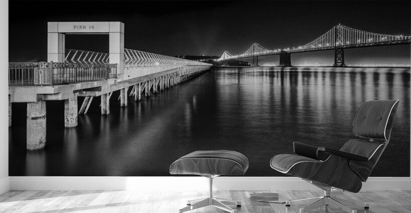 Pier 14 and the San Francisco Bay Bridge at night.